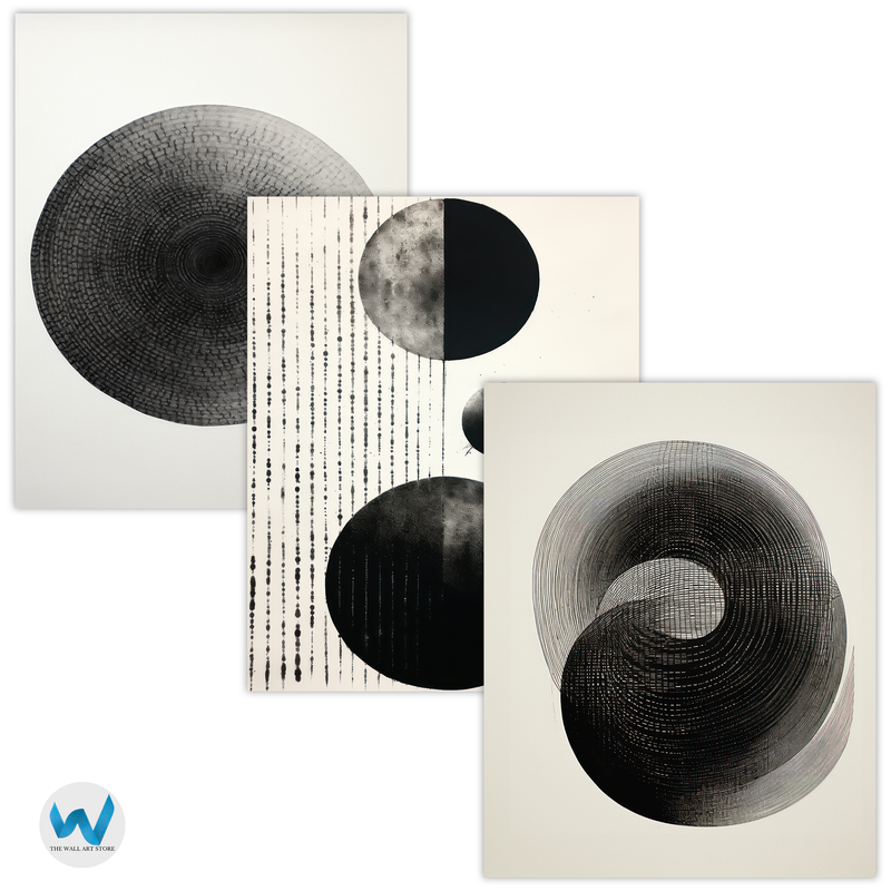 This abstract black-and-white print embodies the essence of modern simplicity with its bold geometric forms and intricate circular compositions. The balance of light and dark, combined with a striking contrast, makes this artwork a refined statement piece. Whether enhancing a contemporary home or an office space, this visually captivating design adds a touch of sophistication and modern elegance to any room.