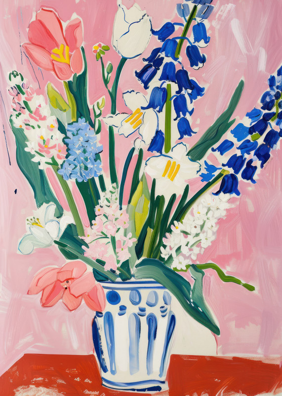 This striking floral still life print showcases a lush bouquet in a decorative blue and white vase, painted in rich, expressive brushstrokes. The combination of soft pinks, deep blues, and fresh greens creates a harmonious balance, making it a refined addition to any space. Whether displayed in a bedroom, dining room, or cozy reading nook, this piece brings warmth and sophistication.