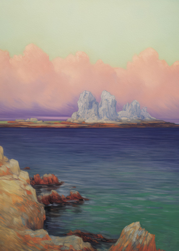 This art print captures a dreamlike moment where pastel pink clouds drift above a rocky island, surrounded by deep blue and green sea waters. The soft gradient sky and reflective water create a sense of calm and wonder, perfect for serene spaces.