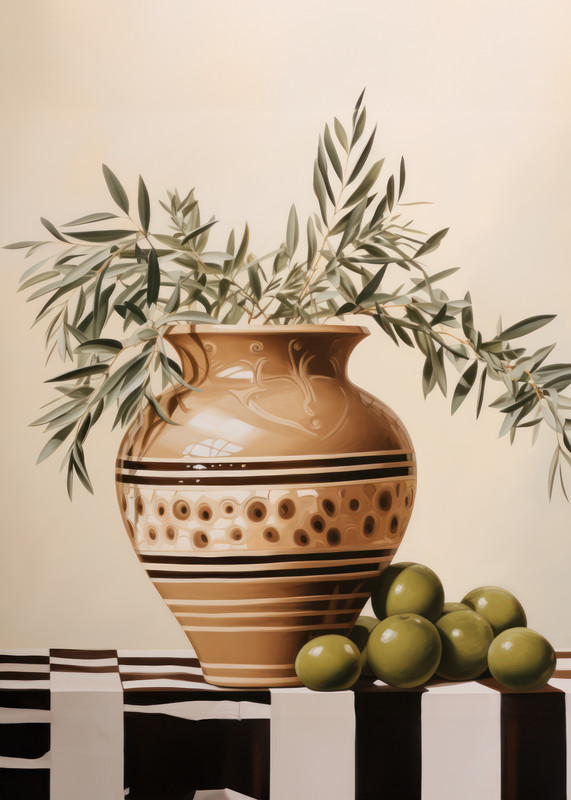 MODERN STILL LIFE DESIGN Add timeless elegance to your home or office with this sophisticated still life poster featuring a beautifully detailed ceramic vase holding graceful olive branches and freshly picked olives. Ideal for kitchens, dining rooms, living spaces, or modern office interiors, this stylish artwork enhances any decor with its Mediterranean-inspired serenity and soothing neutral tones. A perfect match for lovers of contemporary art, interior decorators, and homeowners aiming to enrich their spaces with tasteful, refined visuals.