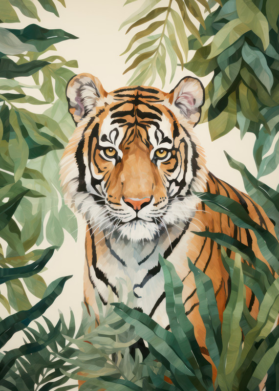 STRIKING TIGER JUNGLE PRINT – This breathtaking artwork captures the intensity and beauty of a tiger peering through lush jungle foliage, perfect for nature lovers.