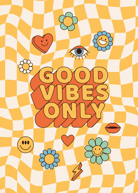 RETRO Y2K AESTHETIC Bring fun energy to any space with this "Good Vibes Only" poster, bursting with cheerful icons, playful flowers, and a wavy checkerboard pattern in retro orange and yellow tones. Perfect for those who love 2000s-inspired design, this artwork is ideal for teens, young adults, or anyone curating an expressive, nostalgia-driven room. A standout choice for bedrooms, dorms, or creative workspaces.