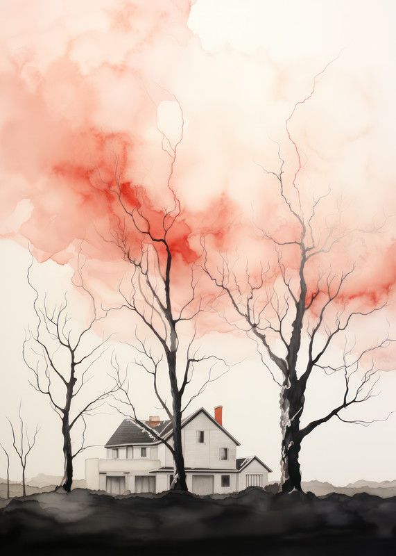 This striking artwork captures a white house surrounded by leafless black trees beneath ominous red and pink cloud formations. The contrast between architectural stillness and abstract chaos evokes a sense of tension and mystery.