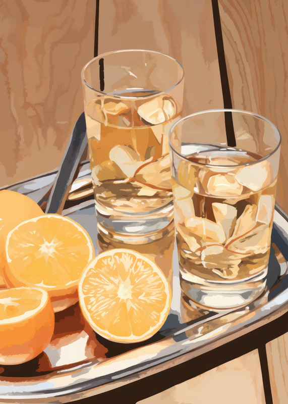 This vivid art poster captures two chilled glasses of citrus iced tea set on a reflective tray with fresh halved oranges. The warm wooden table and golden tones infuse the print with summer nostalgia and cozy kitchen charm. A bright and playful choice for kitchens, breakfast nooks, or dining areas that crave a splash of color and the essence of sunny afternoons.