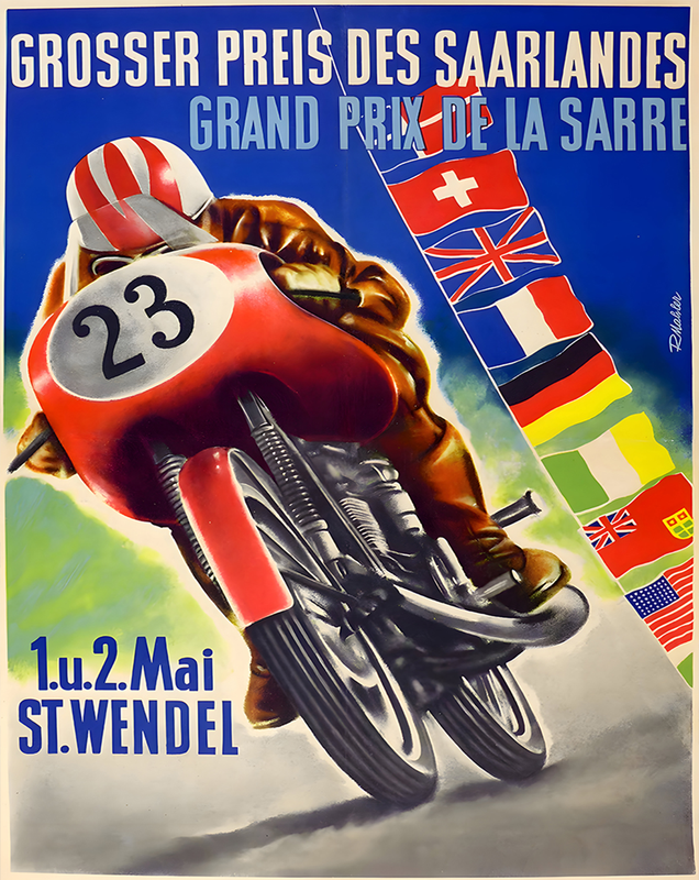 This Grand Prix des Saarlandes poster bursts with motion and color, showcasing a speeding red motorcycle and a vibrant cascade of international flags—an iconic depiction of cross-nation competition.