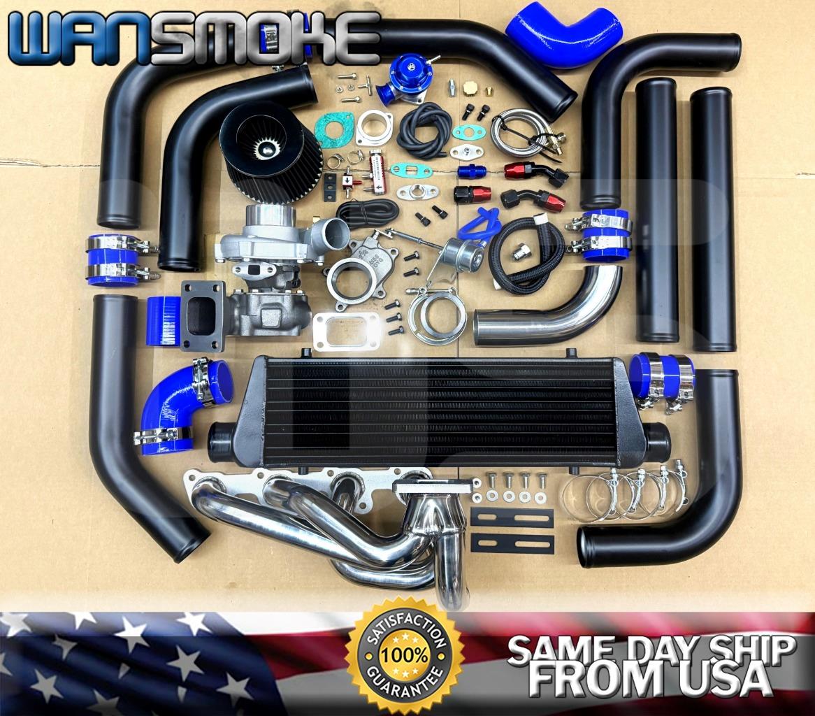 **Fits vehicles running with in 2.1L / 2.3L L4 2316cc / 2127cc 4 Cylinder models or engine swap!! Includes - T3/T4 V-Band Turbocharger Includes - Turbo Manifold Includes - Front Mount Intercooler Includes - Intercooler Mounting Kit Includes - Piping Kit Includes - Silicone Coupler Includes - T-Bolt Clamp Includes - Air Intake Filter Includes - Blow off Valve Includes - BOV adapter Flange Includes - Steel Down Tube Tube Includes - Manual Boost Controller Includes - Oil Feed Line Includes - Oil Restrictor Adapter Includes - Oil Return Drain Line Includes - Oil Pan Drain Plug Adapter Includes - T3 4 Bolt Gasket Includes - V-Band Clamp + Flange T3/T4 TURBOCHARGER 100% Brand New T3/T4 Hybrid Turbocharger! High Quality Guaranteed! cast housing with durable steel. Capable of boosting horse power up To 350+ BHP, standard 4 bolt exhaust flange, Capable of 8 PSI or 15-25 PSI output at peak power. CNC machined flanges. Internal wastegate setting: 8 PSI. High quality t04e with a forged turbine propeller wheel! Turbo Specification: - 2.5" V-band Hot Side. - Standard T3/T4 Flange. - Oil Inlet - 1/8 NPT Oil Inlet. - Bearing Type - Journal Bearing. - Wet Floating Bearings. - Cooling Type: Oil Cooled. Compressor Specs: - 3" Compressor Inlet. - 2.07" Inducer. - 2.36" Major. - 2" Compressor Outlet . - T04B/T4 Type Compressor Housing. - Compressor .50 A.R. - Compressor .57 Trim. - 8 Blade Type T4 Compressor Wheel. Turbine Size: