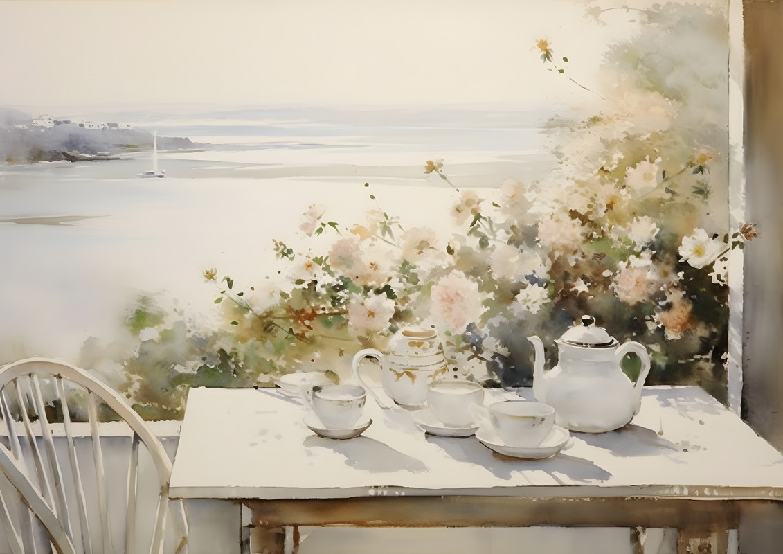 Invite the calm of a dreamy seaside tea garden into your space with this elegant watercolor artwork. Delicate florals frame a rustic table set with a classic teapot and cups, against a misty coastal backdrop. Perfect for those who appreciate romantic, serene, and timeless decor with a soft, natural charm