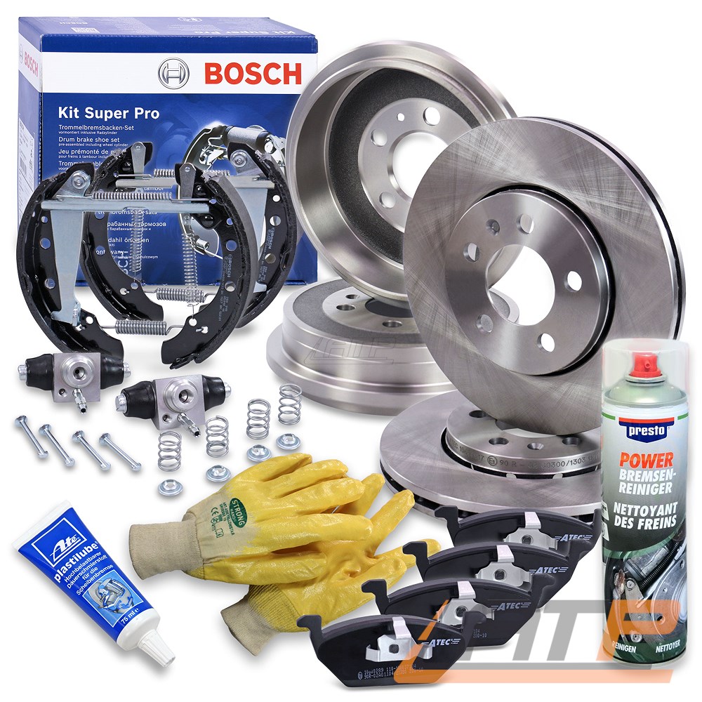 2x Bremsscheibe + Bremsbeläge + 2x Bremstrommel + BOSCH Super PRO Vorder- und Hinterachse