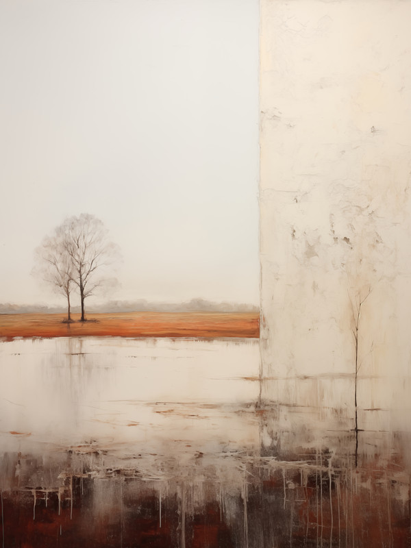 A striking fusion of abstract form and serene landscape, this piece features twin trees and a large textured panel creating a stark contrast of geometry and nature