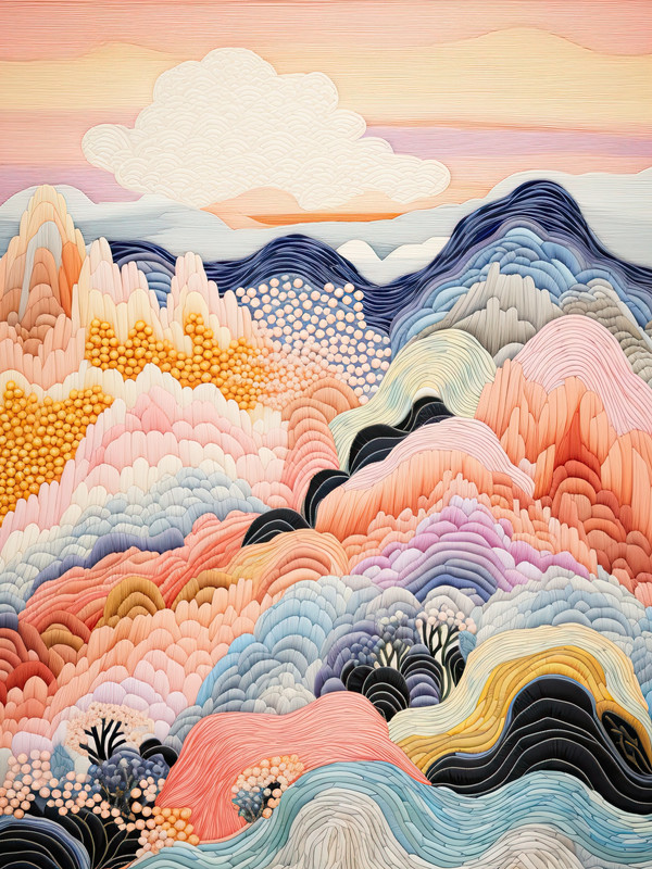 An abstract depiction of flowing mountains and dreamy clouds in soft layered textures and a gentle pastel color palette, evoking calm and imagination