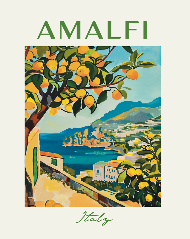 This travel art print beautifully captures the essence of Italy’s Amalfi Coast with a colorful scene of lemon trees, seaside cliffs, and sun-drenched villas. The bold brushwork and rich palette bring a cheerful, summery atmosphere into your space. Ideal for travel lovers or anyone dreaming of Mediterranean escapes.