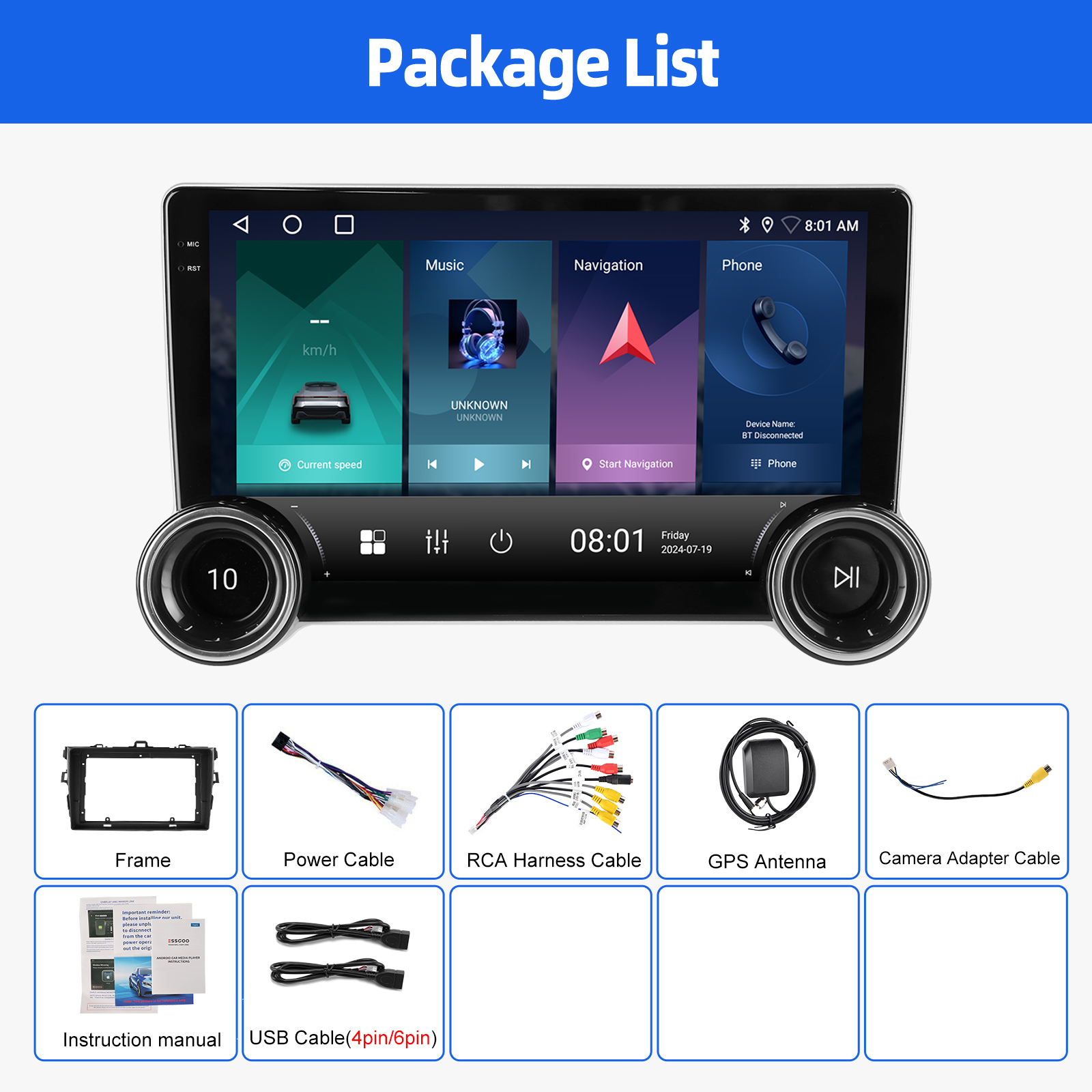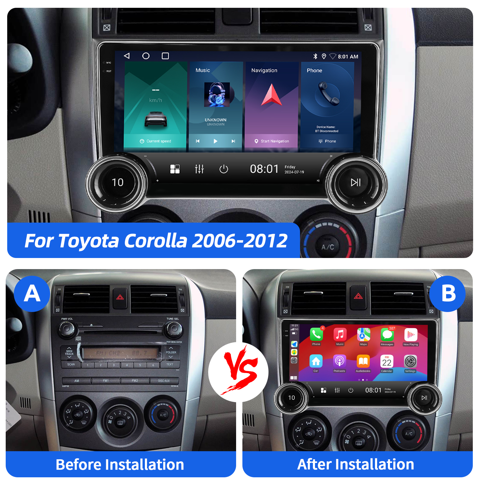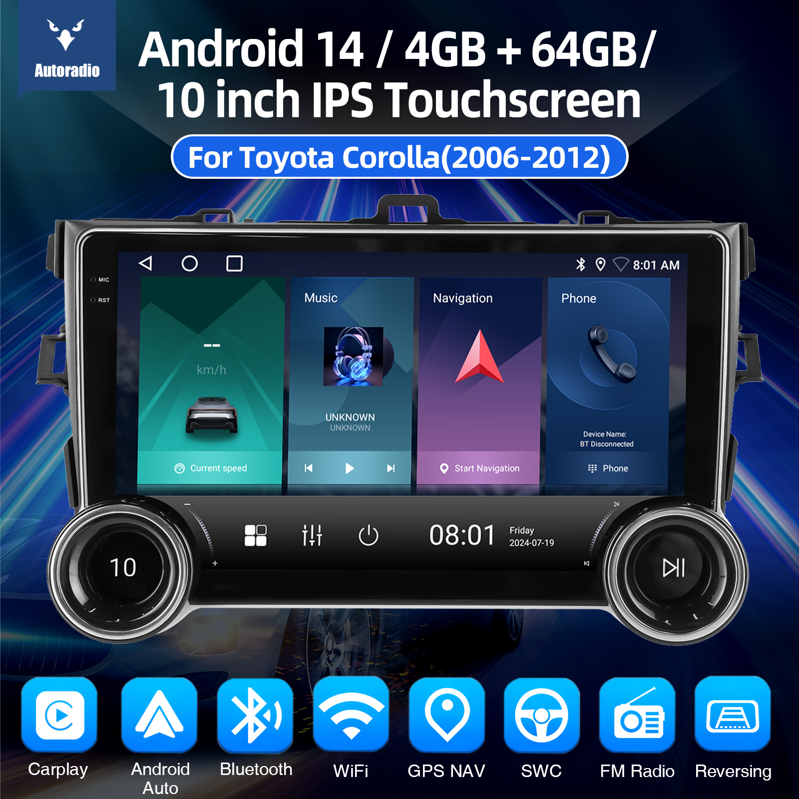 10.1 Inch Android 14 Car Radio For Toyota Corolla 2008-2013: The Android car radio with 9" 1280*720 HD capacitive touch screen, 4GB RAM and 64GB ROM allows you to download your favorite apps and videos, so that driving will never be boring .No additional frame, no cable change, plug and play.