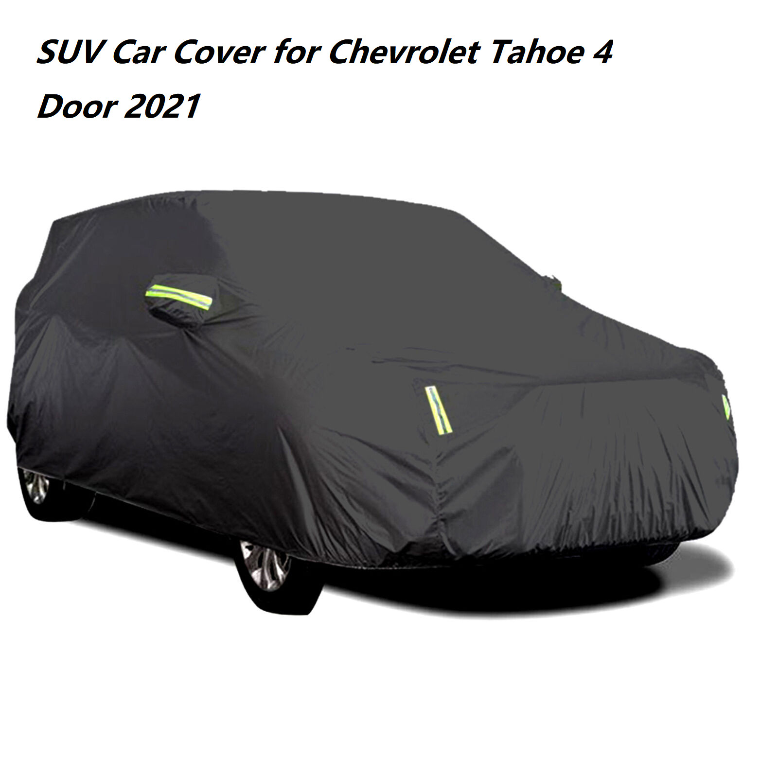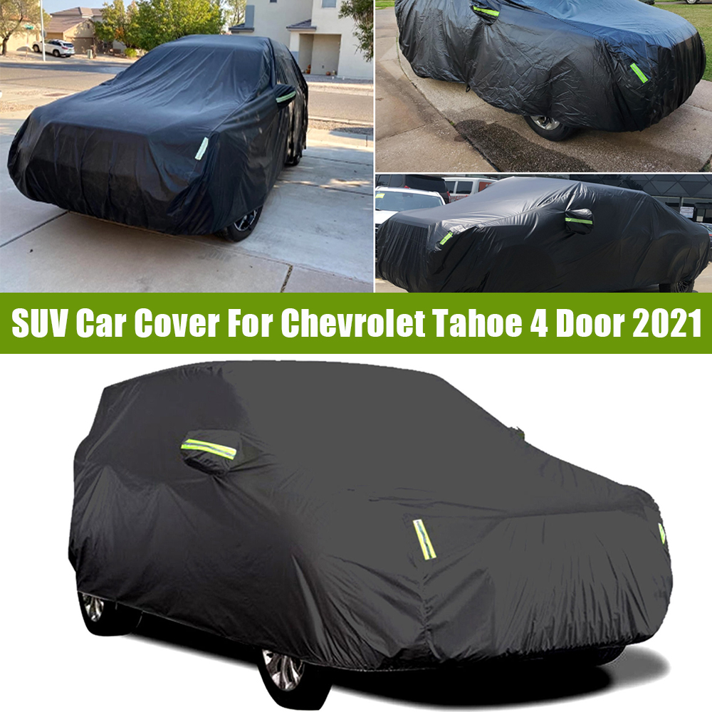 Fitments: Fits for Chevrolet Tahoe 4 Door 2021 Features: 【Premium-Quality】It's Great For Anti-uv, Heat Protection, Scratch-Resistant. 【Best Protection】Made of waterproof Polyester cloth, longer lifetime than other materials in same weather. 【Friendly Design】Comes with fluorescent reflective strips that protect your car security at night. Designed with fluorescent green color emits light at night to avoid unexpected impact. Driver Door Zipper: For easy access anytime. Windproof Straps and Elasticized Hem: Double windproof design to fix on the car against strong winds. 【All Weather Protection:】Thick weatherproof car cover provides overall protection of the vehicle from all weather elements: dust, snow, droppings, leaves, pollens, rain and other harmful elements. 【Upgraded Material】Adopts secure materials: 210T-PU with double stitched and reinforced seams, made for indoor and all elements outdoor. Good for snowproof in winter, keeps cool in summer. 【Easy to Carry】Provide a car cover and a waterproof bag, can easily fold the cover and carry it with you in the trunk. Don’t take up extra space. Specification: Color: Black Material: 210T Polyester Dimension: 540x210x150cm / 213"x83"x59"(L*W*H) Installation: Easy Drape On Installation Packing Include: 1x SUV Car Cover 1x Storage Bag
