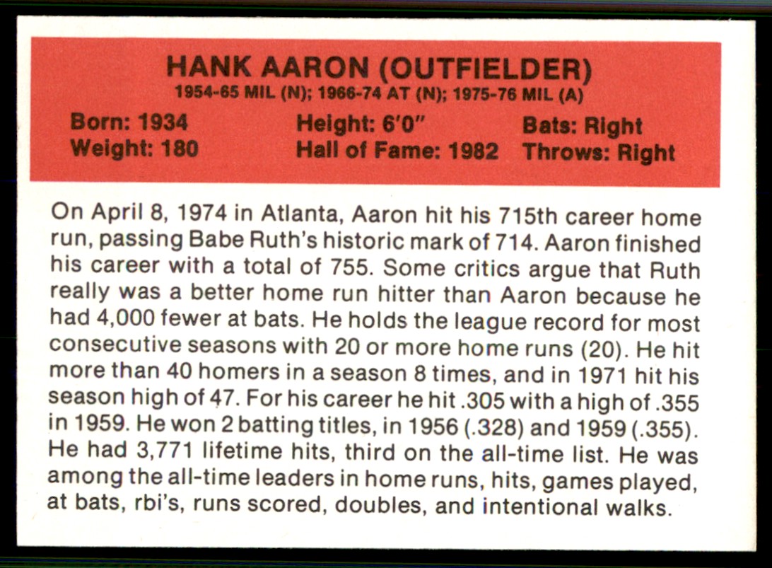 1987 Hygrade Baseball's All-Time Best Hank Aaron Braves