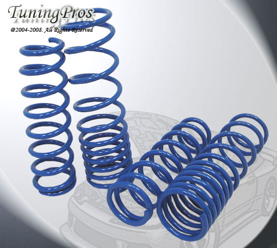 These springs are made with "SAE 9254," the strongest material from Japan. Our new material will offer a stronger product that is lightweight and corrosion-protected with its phosphate and powder coatings. The result is a spring that specifically offers racecar handling, yet maintains smooth and comfortable ride characteristics. Carefully matched springs rates provide exceptional handling, response, control and balance. Springs lower approximately at stated in detail below. The lowered center of gravity improves performance and increases stability, as well as enhancing the appearance of the vehicle.
