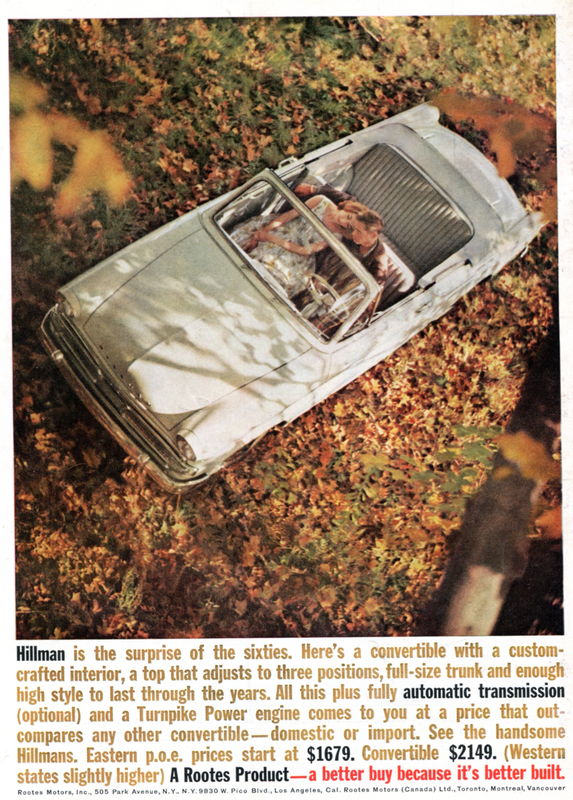 Celebrating British automotive innovation, this Rootes Motors ad highlights the Hillman’s convertible design, luxurious interior, and versatile top. The ad’s aesthetic pairs soft natural tones with confident product messaging, making it a stylish and nostalgic wall accent.