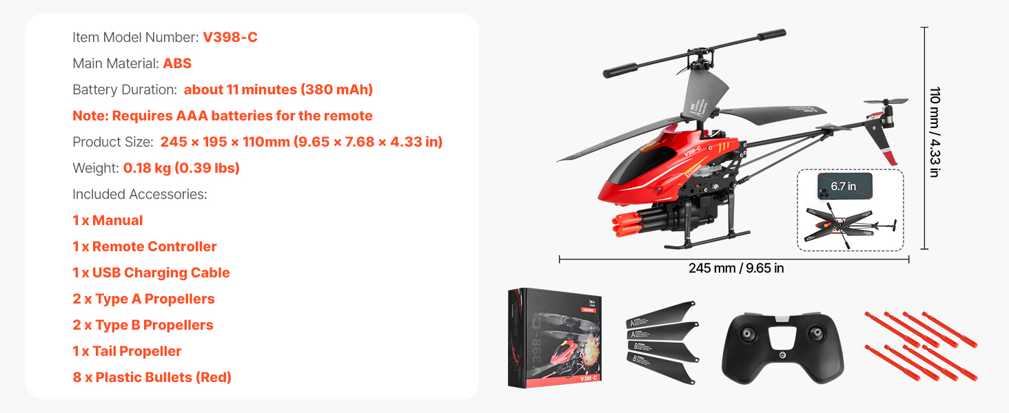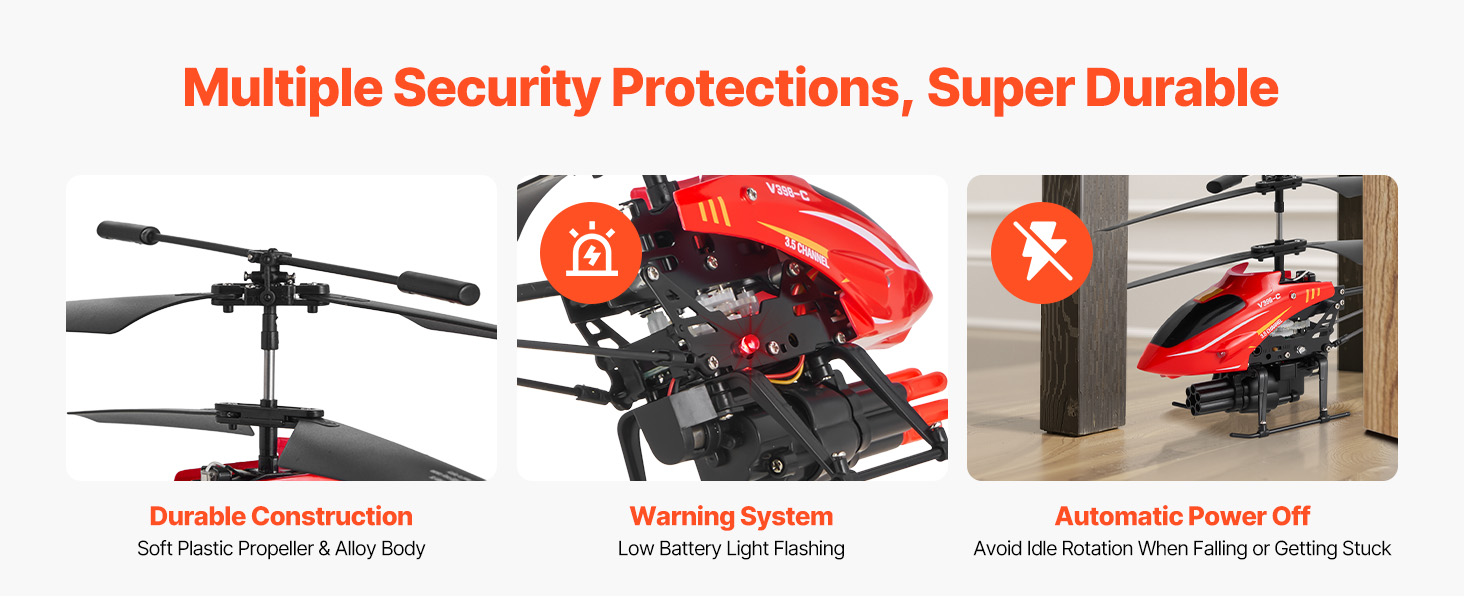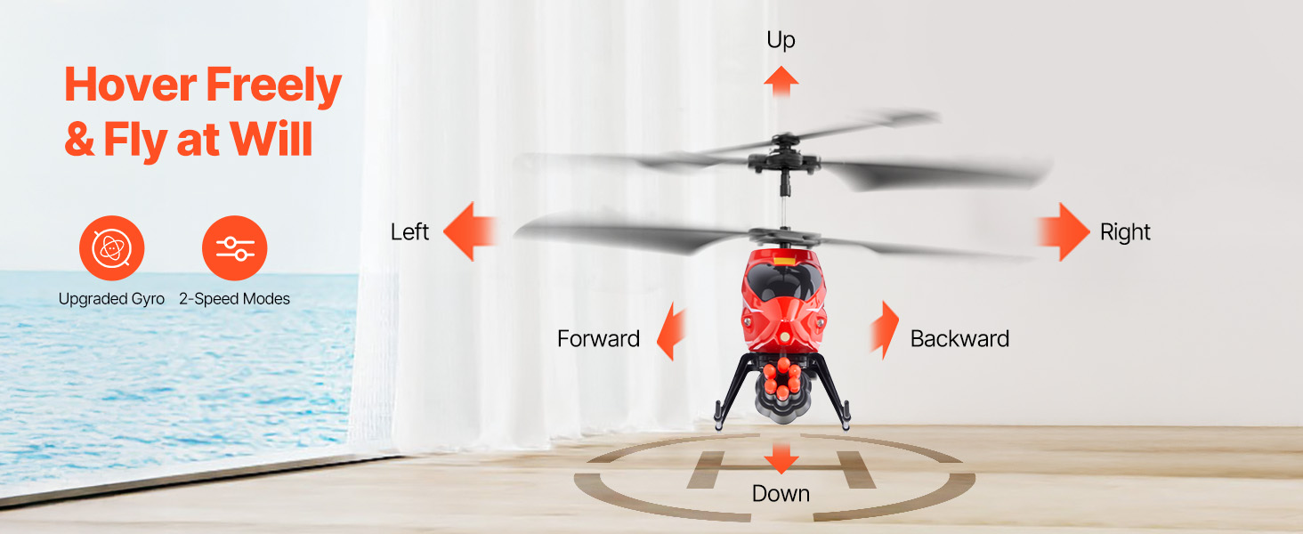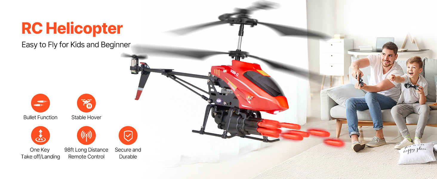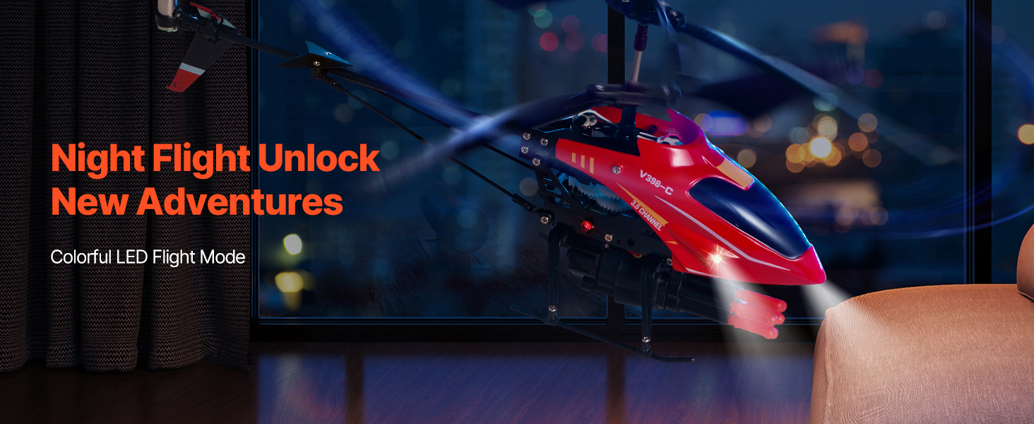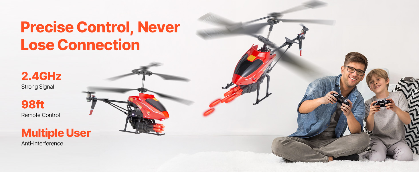 This RC helicopter features one-key takeoff/landing and an advanced gyroscope system for simple, stable operation. Made with durable, shock-resistant materials, it comes with a 2.4GHz remote for precise long-distance control. Ideal for children aged 8 and up. The vibrant lights add extra fun.