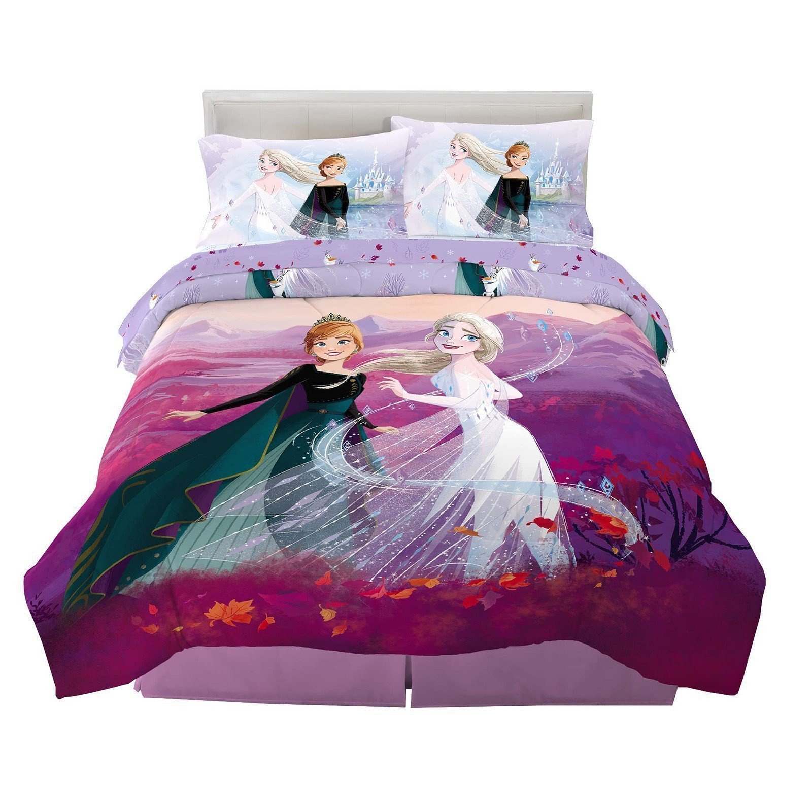 - TWO DESIGNS IN ONE COMFORTER: Sisters Anna and Elsa make a colorful pair against a pink and purple backdrop on one side of this comforter. When it's time to redecorate, simply flip it over to reveal an all-over print of the sisters with Olaf the snowman against a wintry pastel backdrop on the other side.