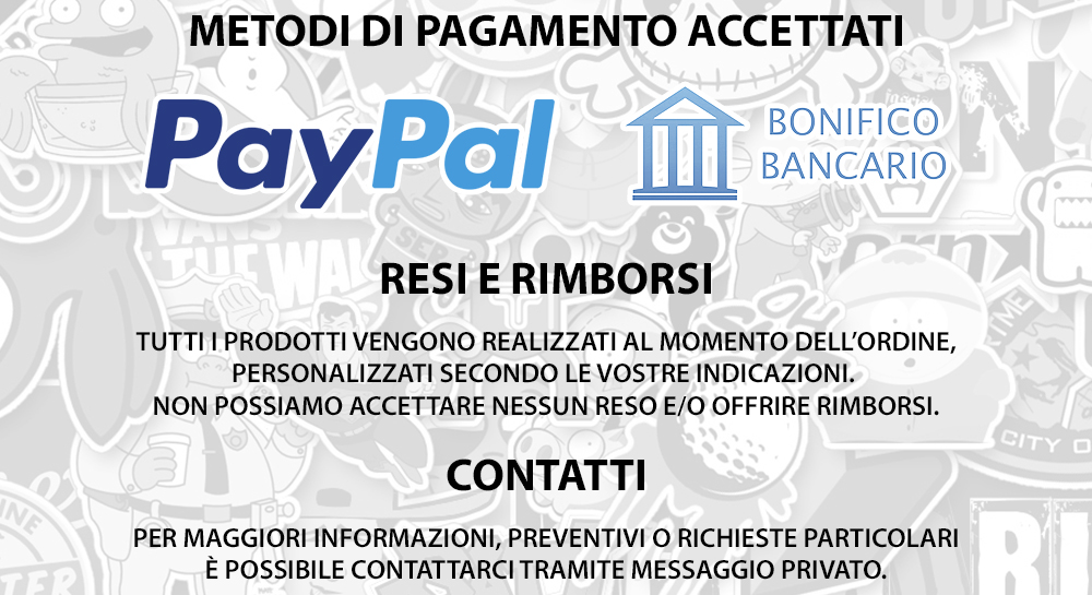 Le immagini, i marchi ed i modelli che appaiono in queste pagine sono di proprietà esclusiva dei rispettivi costruttori e vengono utilizzati al solo scopo illustrativo, per mostrare le nostre grafiche e gli adesivi commercializzati (ex art. 21 L.10/02/2005, n.30). Si precisa altresì che l'articolo propone riproduzioni non originali di grafiche, stemmi e marchi celebri il cui uso è consentito a fini esclusivamente decorativi ed ornamentali. Qualsiasi uso difforme è vietato dalla legge e ricade sotto la piena responsabilità dell'acquirente. I prodotti relativi a marchi e loghi o grafiche eventualmente coperti da diritto d'autore (L. 633/1941) sono realizzati su richiesta dell'acquirente il quale, con l'accettazione del contratto, dichiara espressamente che dispone dell'autorizzazione per l'uso e la riproduzione dell'adesivo richiesto e possono essere acquistati esclusivamente in quantitativi singoli
