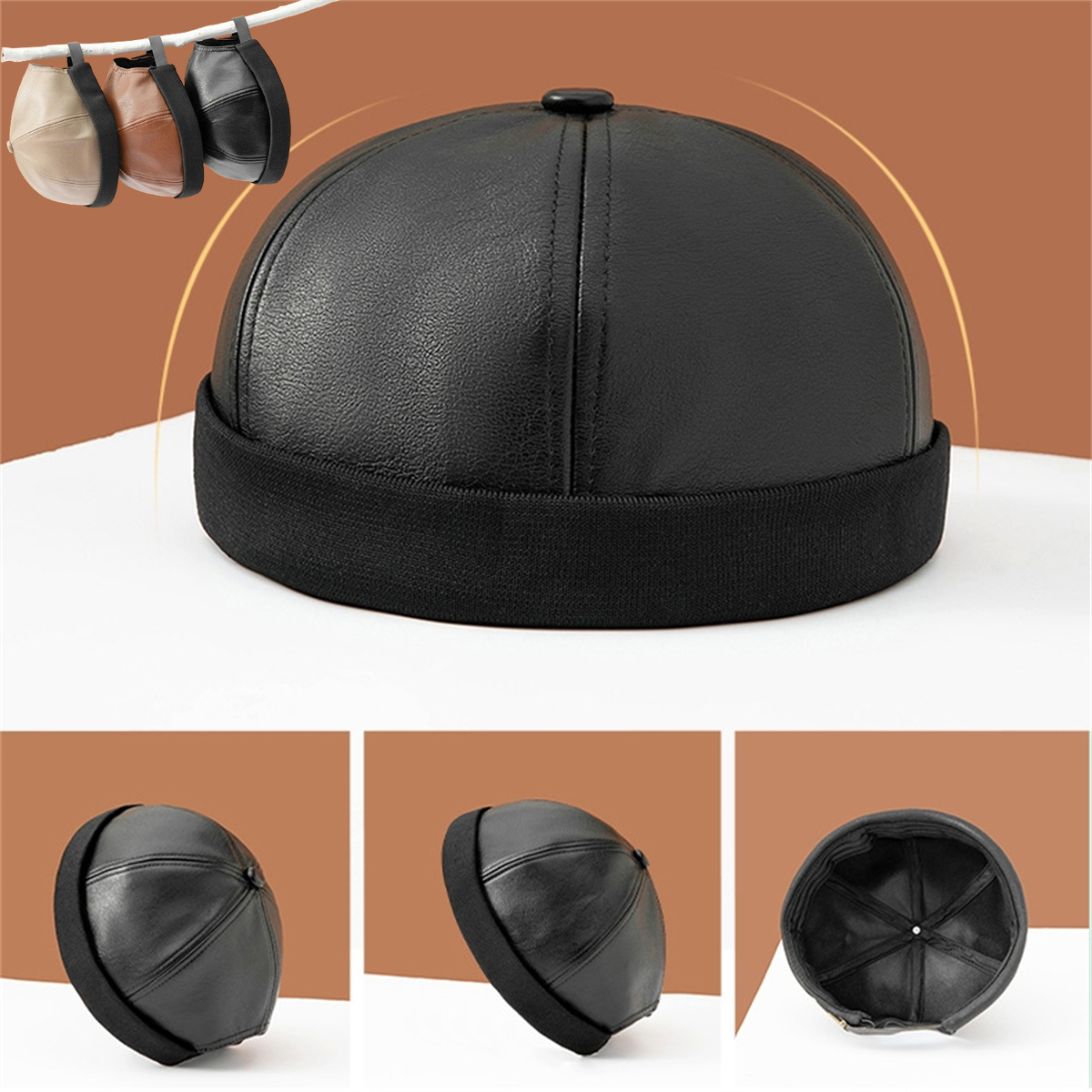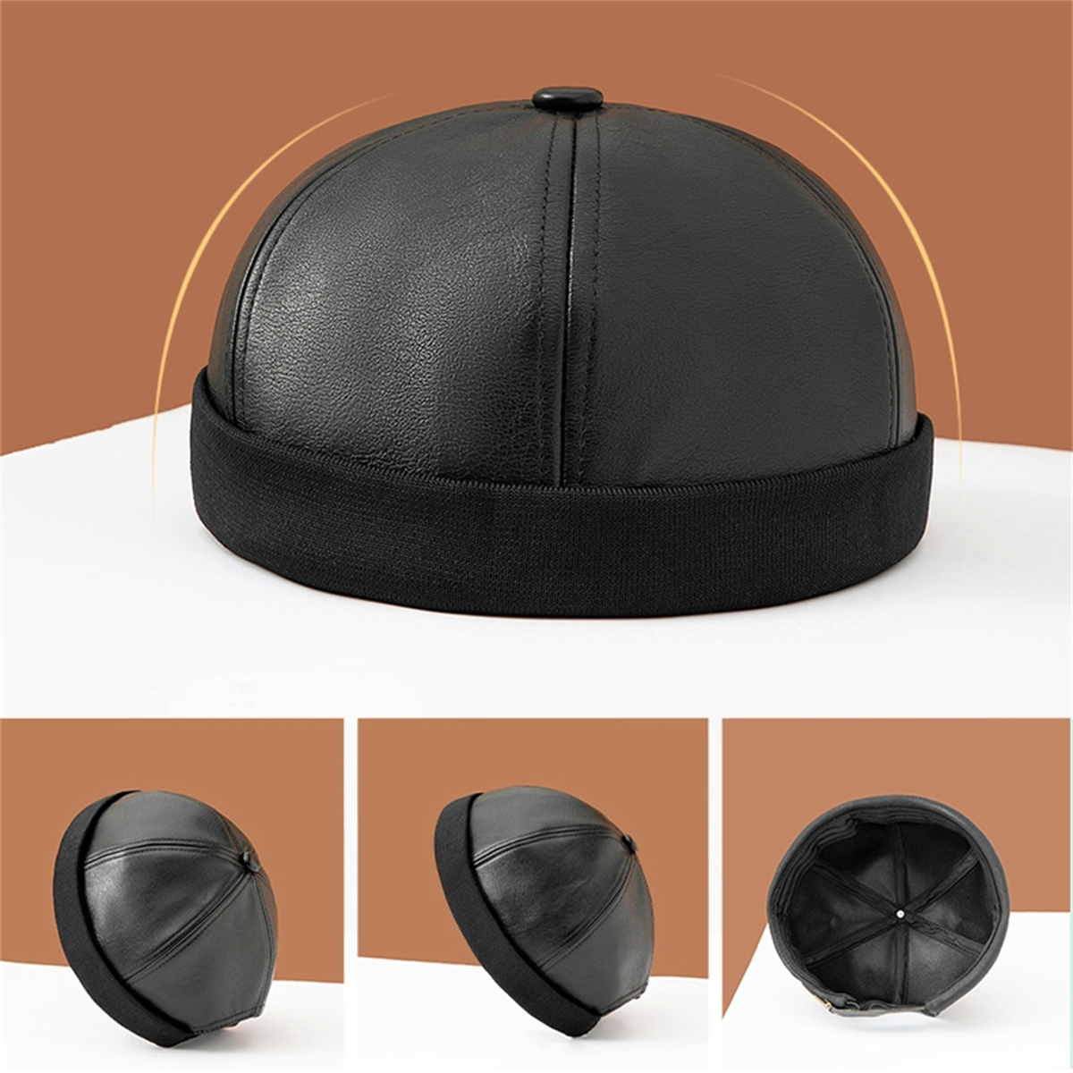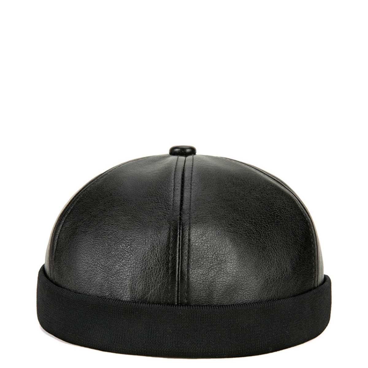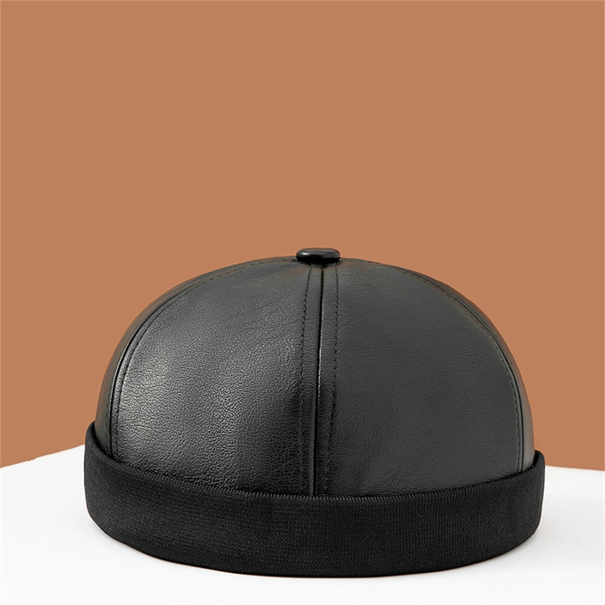 Men Leather Warm Skullcap Sailor Brimless Rolled Cuff Beanie Cap Solid Hat