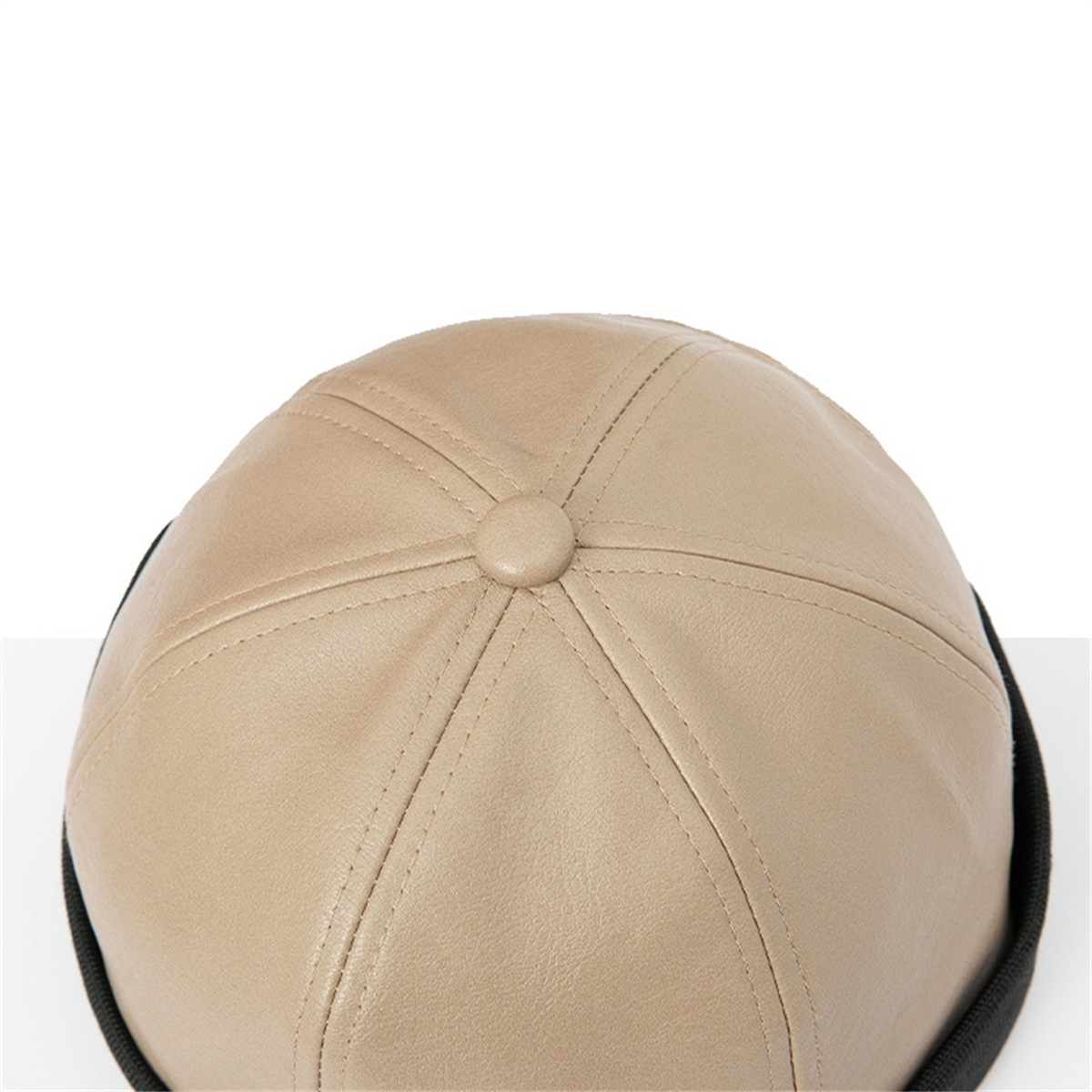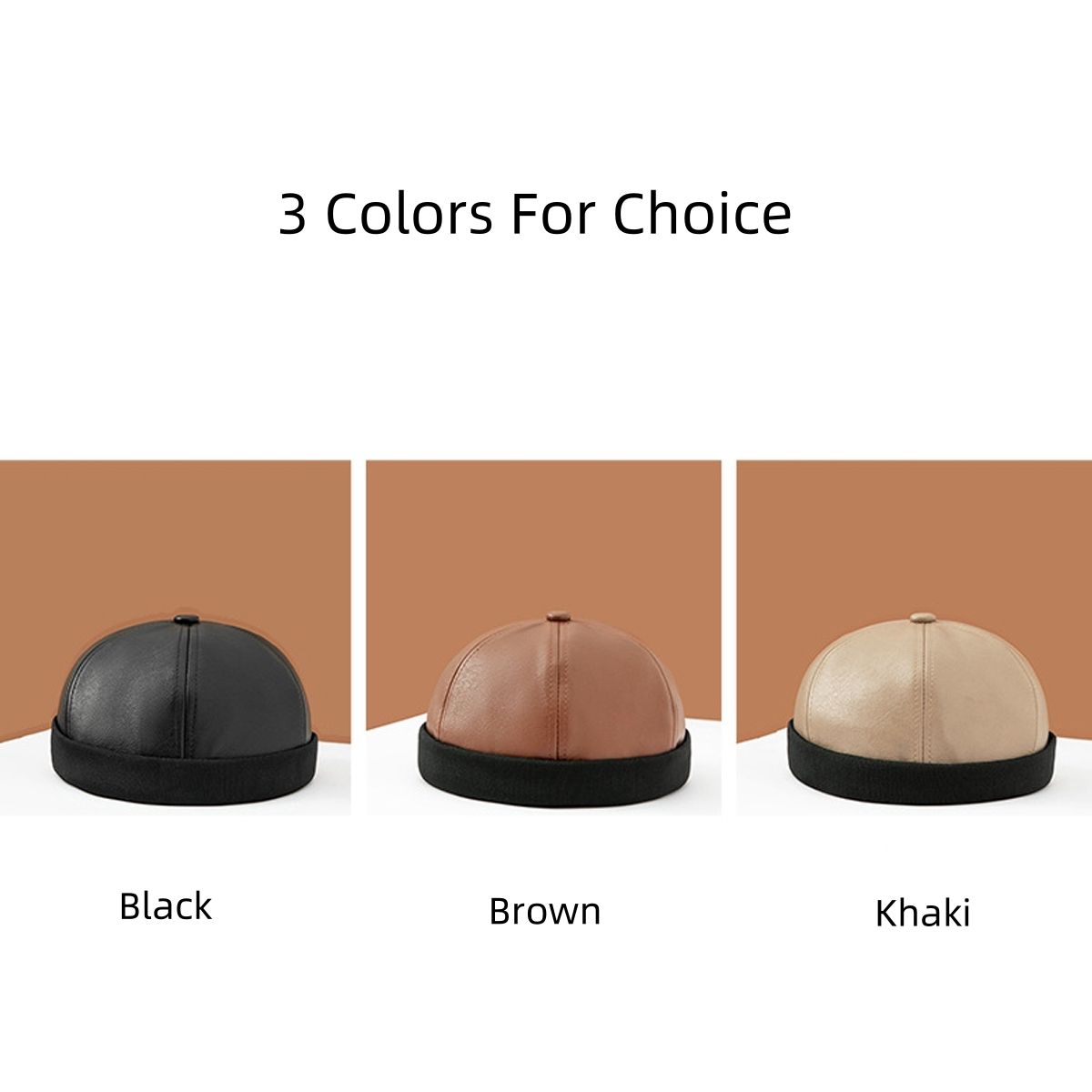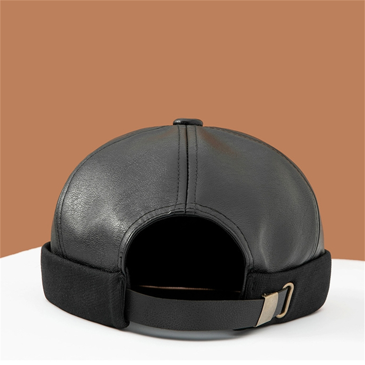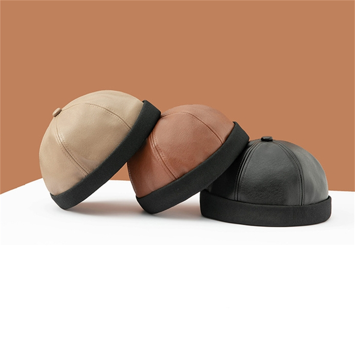 Men Leather Warm Skullcap Sailor Brimless Rolled Cuff Beanie Cap Solid Hat