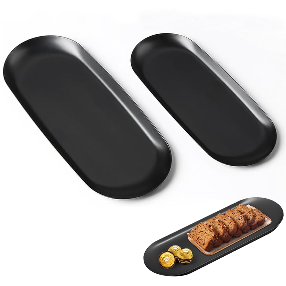 Lot de 2 petits plateaux noirs - En acier inoxydable - Plateau de service ovale - Plateau décoratif pour cosmétiques et desserts (2 tailles)