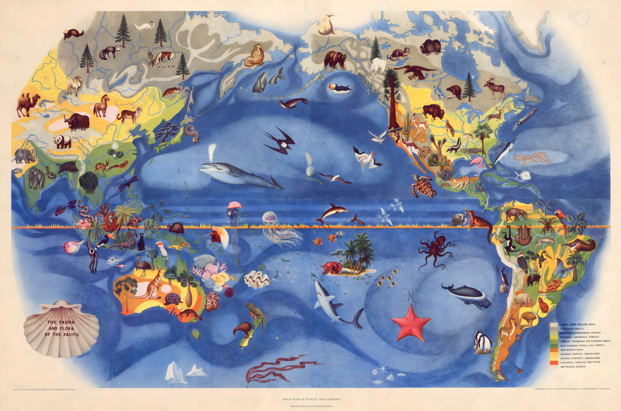 This richly illustrated poster depicts the diverse wildlife and plant ecosystems across the Pacific and surrounding continents. Featuring species from tropical reefs to arctic tundra, it’s a fascinating visual celebration of Earth's biodiversity