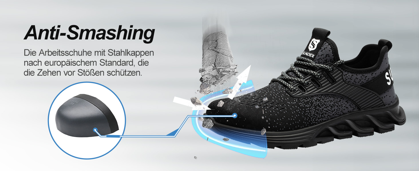 Steel Toe Shoes :SUADEX Indestructible steel toe shoes meet European standards bearing a force of 200±4J. The safety shoes can easily deal with any accidents at work, and keep your toe safe at all day.