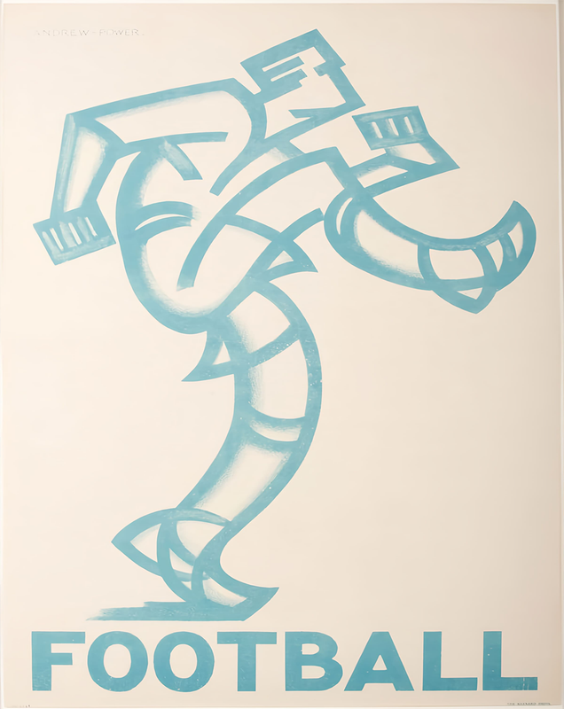 Striking Geometric Composition This modernist football poster by Andrew Power captures an abstract figure in mid-kick, rendered in bold blue lines. With stylized curves and sharp angles, it evokes the power and rhythm of the game in a distinctly graphic language