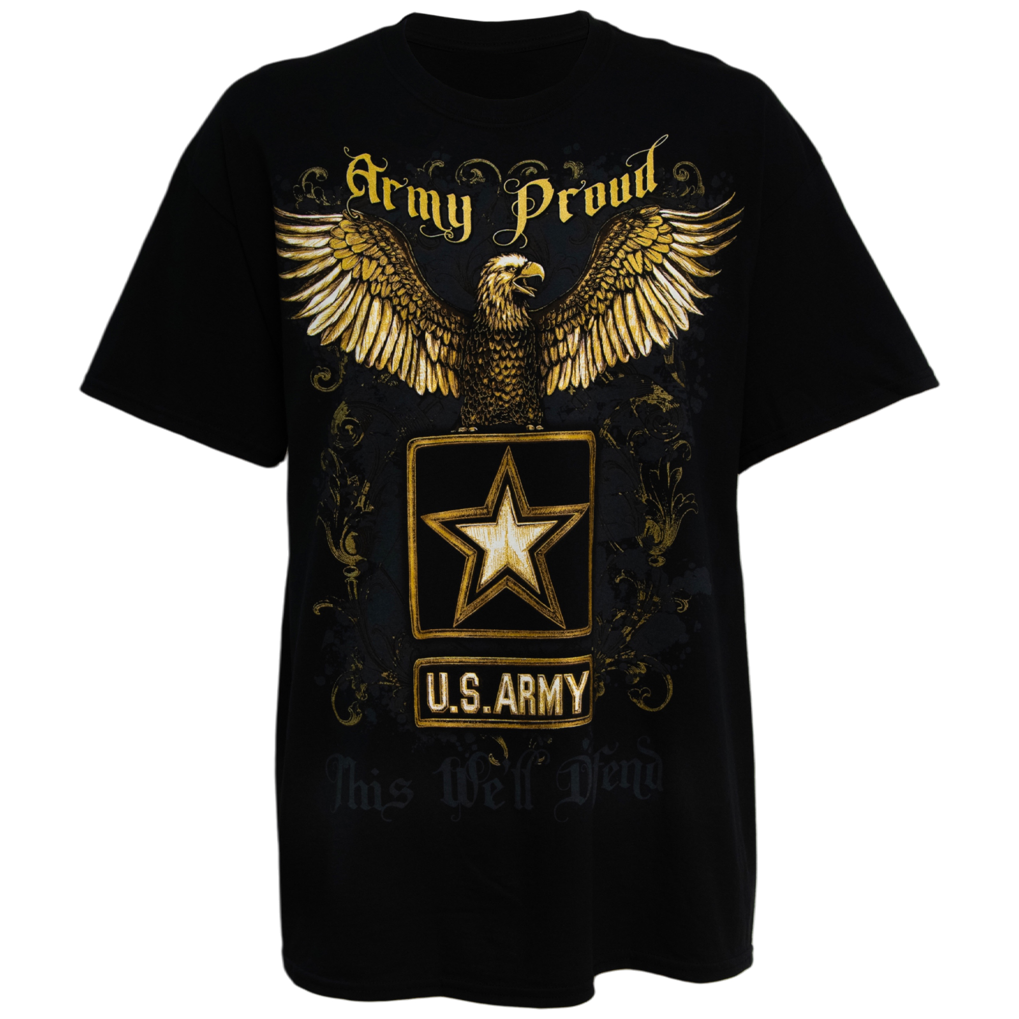 Display your military support with pride in the officially licensed Army Logo graphic print t-shirt. A perfect gift for a veteran or a supporter of the Army, this men's short sleeve, crew neck t-shirt in black features a front gold graphic print of an eagle and the Army. Made of 100% cotton for comfort, this men's patriotic tee is machine washable for easy care. Tagged a men's shirt size x-large. Measurements: 24" Chest, 31" Overall Length, 8" Sleeve Length.