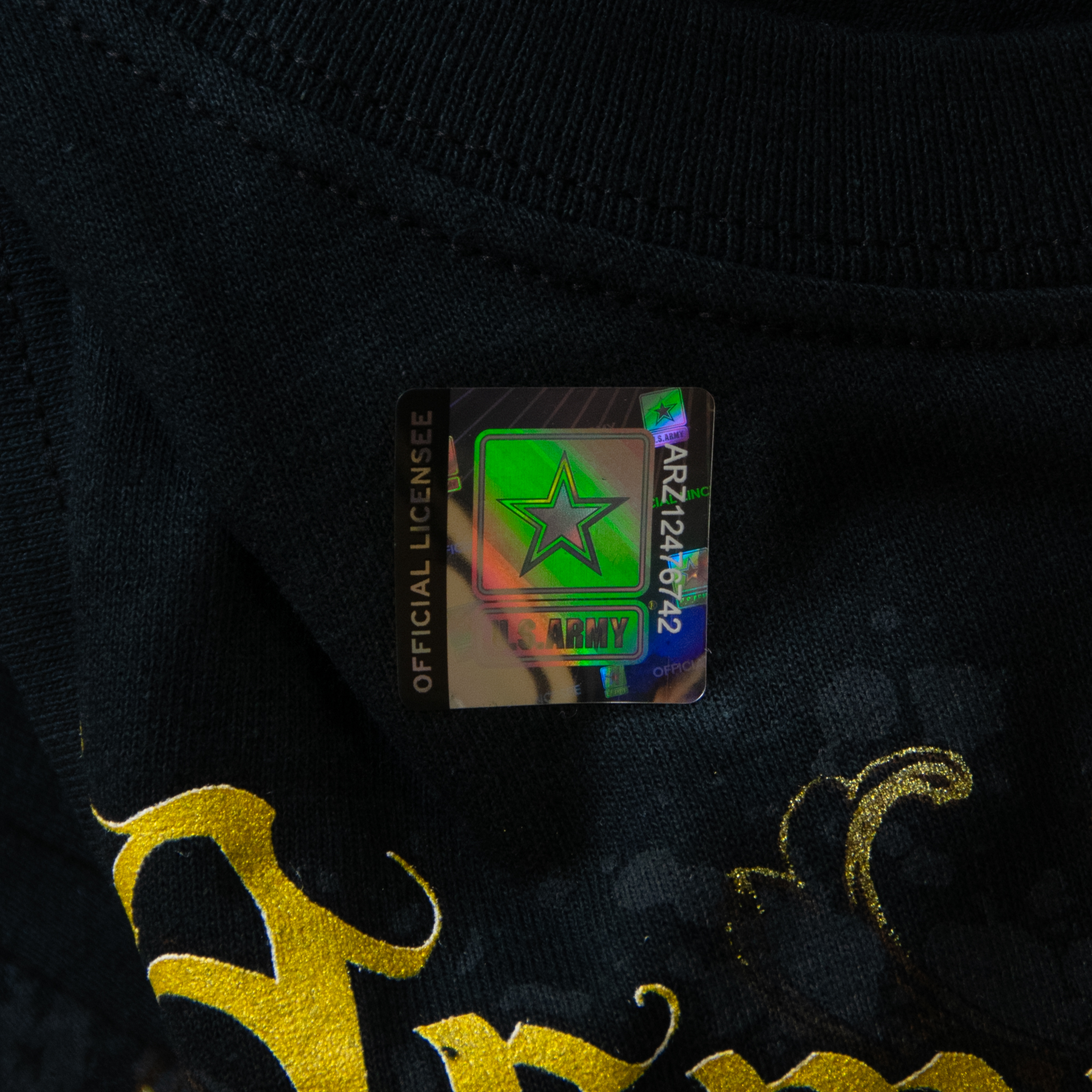 - This men's armed forces t-shirt's front features a gold eagle and the Army logo.