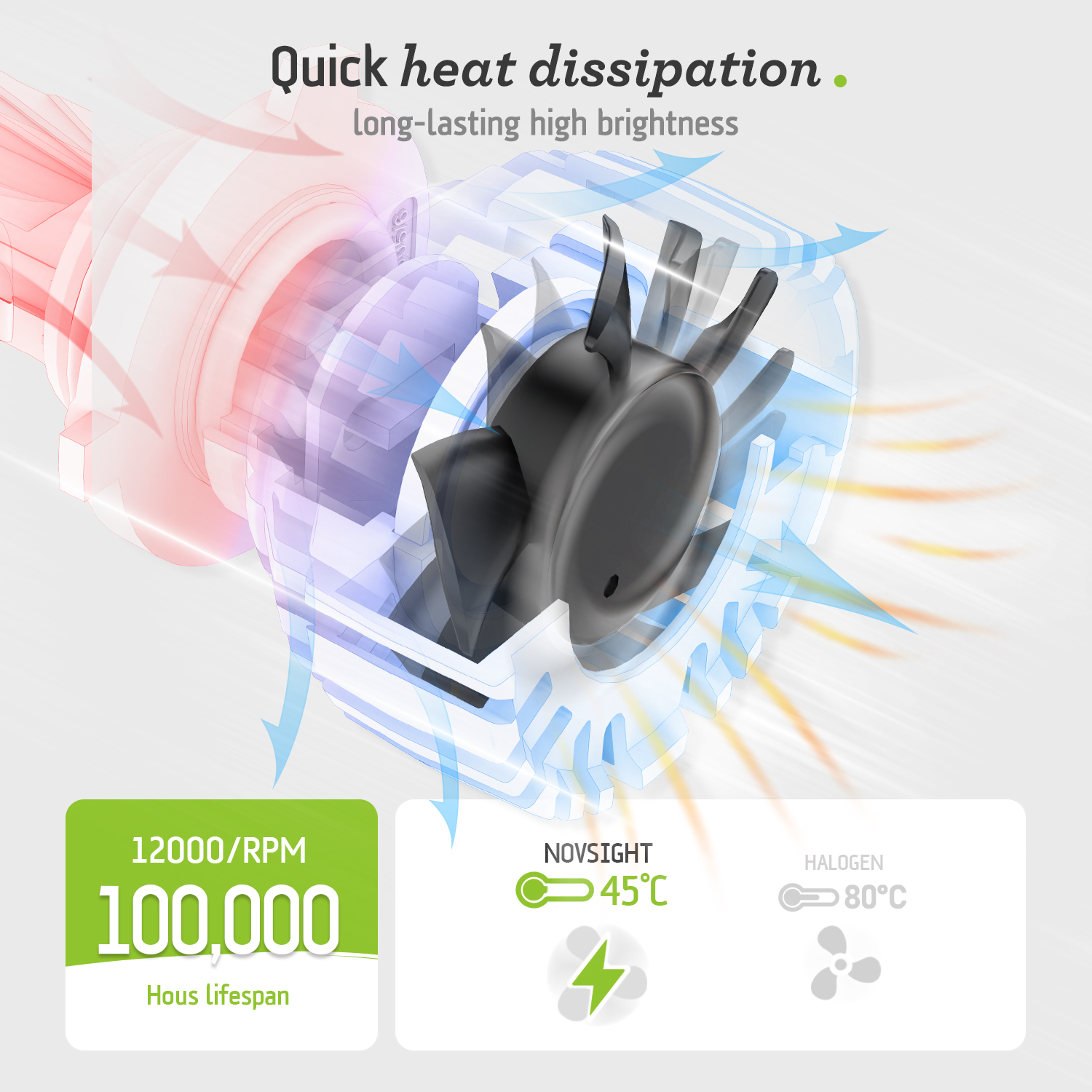 【Efficient Heat Dissipation System】 NOVSIGHT LED Bulbs are made of copper backing and dual pure copper heat pipes, which conducts heat quickly and withstands more power, allowing the LED chips to run more stably and provide brighter light. Aviation aluminium housing and NMB dual-ball silent 12,000RPM fan form a highly efficient cooling system, which rapidly cools the lamp body and extends the average lifespan of each lamp to 100,000 hours.