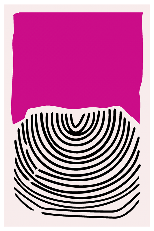 This striking abstract print features a vibrant block of hot pink above a rhythmic field of curved black lines on a soft background. The contrast between solid color and repeating geometry creates a bold visual presence that brings energy to contemporary interiors