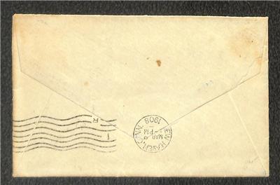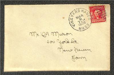 USA Scott 319 stamp tied by March 9, 1908 Vineyard Haven, Massachusetts duplex handstamp on commercial cover sent to New Haven, Connecticut with same day receiver.