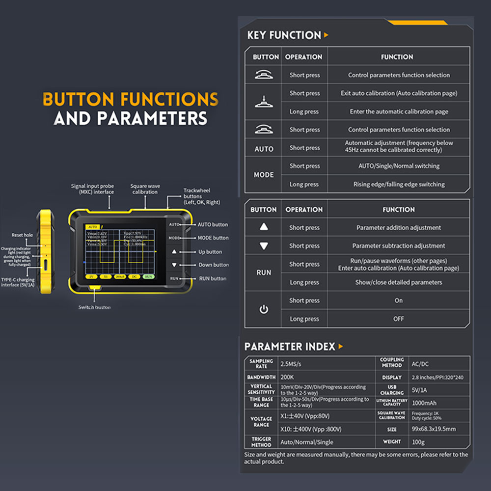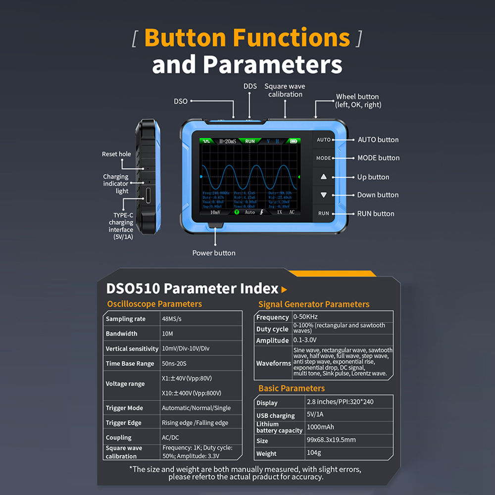 1. 2-in-1 function: the product built-in oscilloscope and signal generator function, the product is compact and cost-effective.
