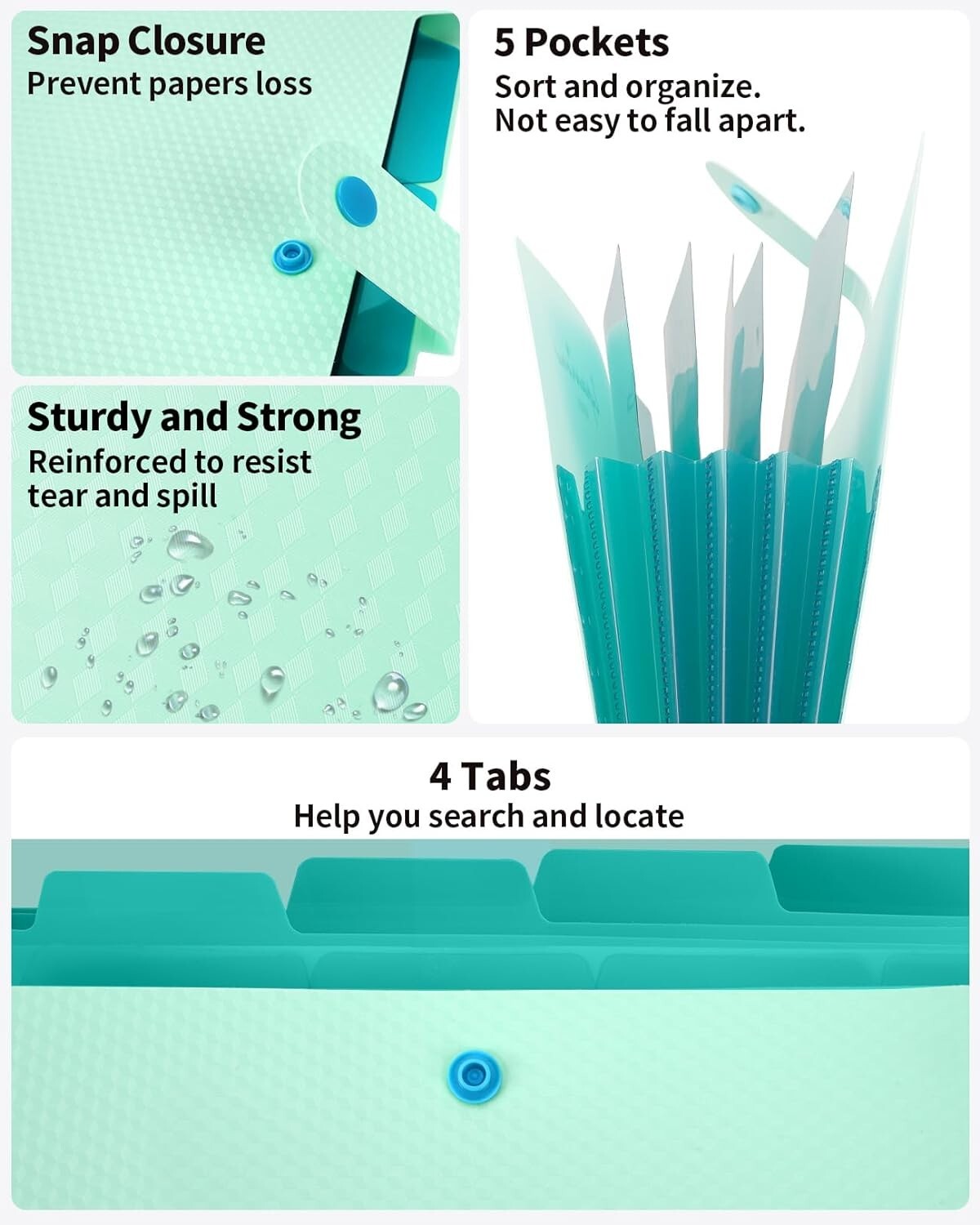 Stylish Green Document Organizer - Lightweight Accordion File Folder with Tabs