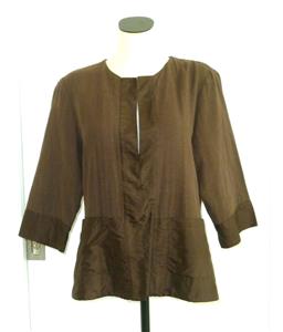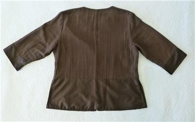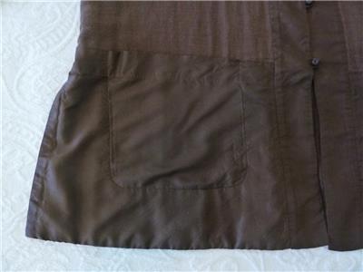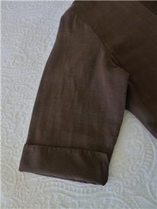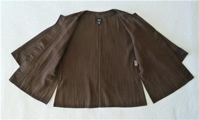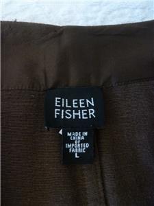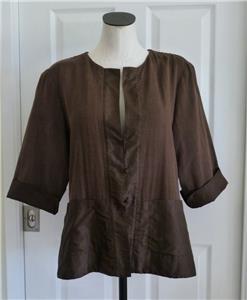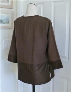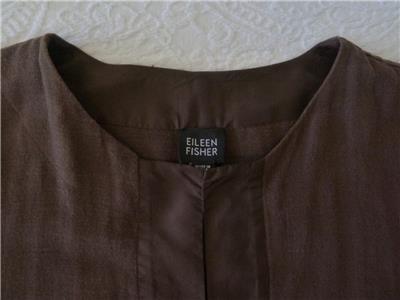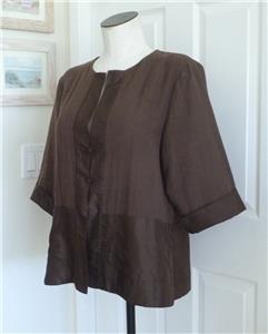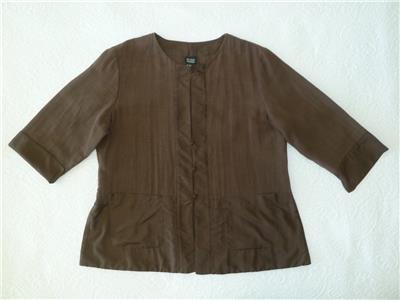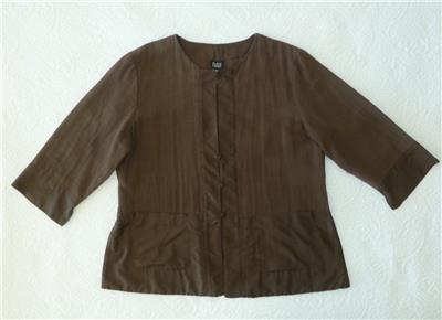 Here for your consideration is a fabulous and rare topper jacket by EILEEN FISHER. Tag size L, please check measurements below. Lovely combo of soft woven 100% cotton and luxurious 100% silk in dark chocolate (Brownstone?). Silk is placed over the cotton on the inside of the neck and the front and back sections along the hem, as well as on its own down the front placket and along the sleeve opening. Split round neckline, three knotted buttons (extra inside), patch pockets, side slits, sleeve slits for cuffable option, 3/4-length sleeves. Unique yet simple styling lends itself to many outfits and occasions. Sure to be a year-round go-to garment. I haven't been able to find another; similar styles retail $328. In excellent condition. Best to review all 17 photos to fully appreciate. Enjoy!