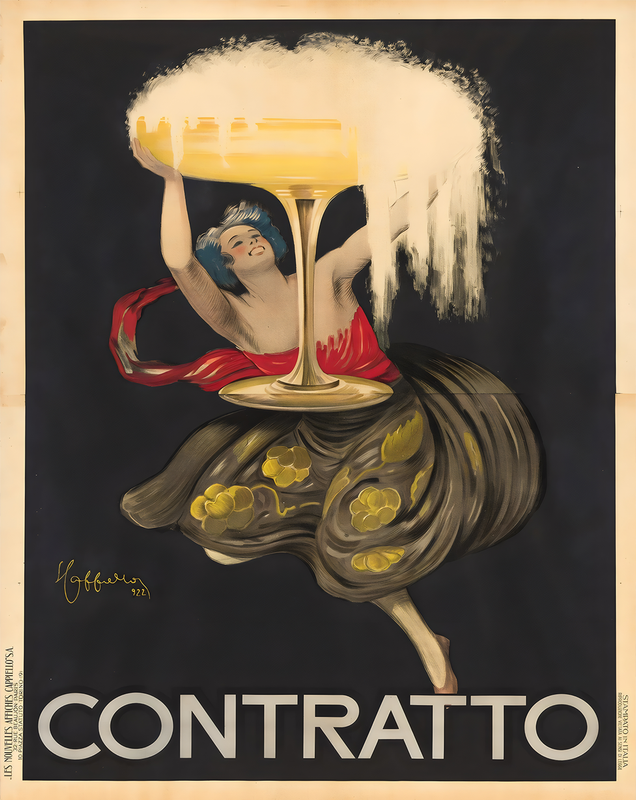 Iconic Beverage Advertising This vintage Contratto champagne poster by Leonetto Cappiello, created in 1922, captures the opulence and celebration of Italian sparkling wine. Featuring a dancing figure holding an overflowing golden glass, this bold and theatrical composition is a favorite among collectors of vintage drink advertising and Italian art