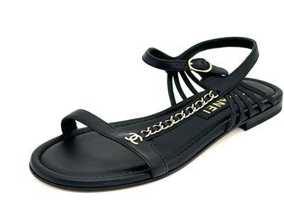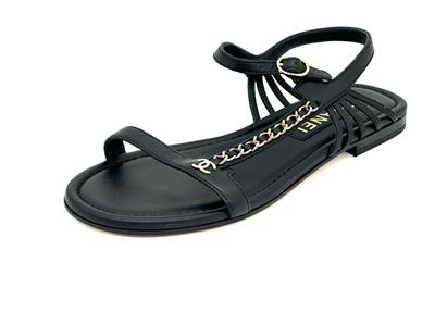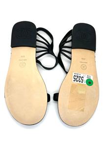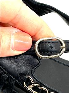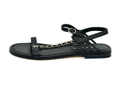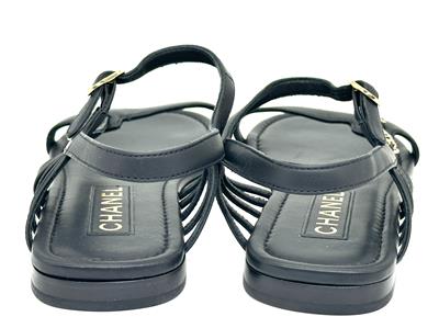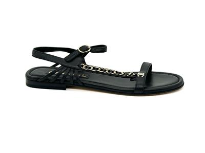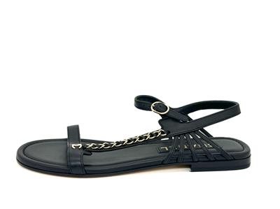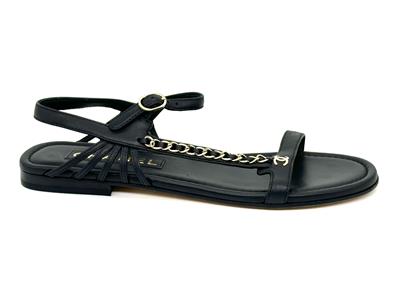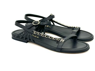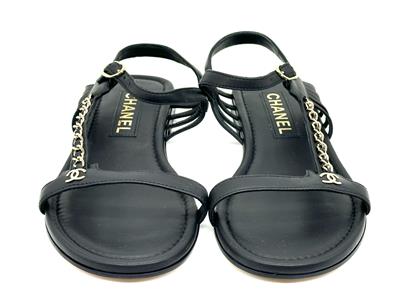 Lambskin leather strappy sandals with interwoven goldtone chain embellishment and CC logo.Chanel signature on the goldtone buckle at ankle strap. Padded leather insole. Leather sole. Made in Italy. Designer color: Black..