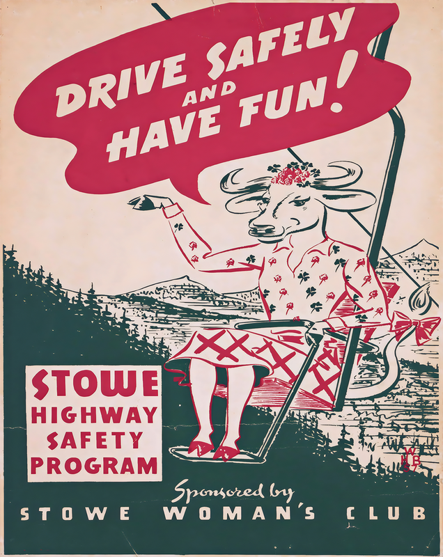 Retro Roadside Whimsy – This playful safety poster features a humanized cow on a ski lift encouraging safe driving with a cheerful message: “Drive Safely and Have Fun!” The vintage illustration is filled with quirky charm, setting a friendly tone with a 1950s visual flair.