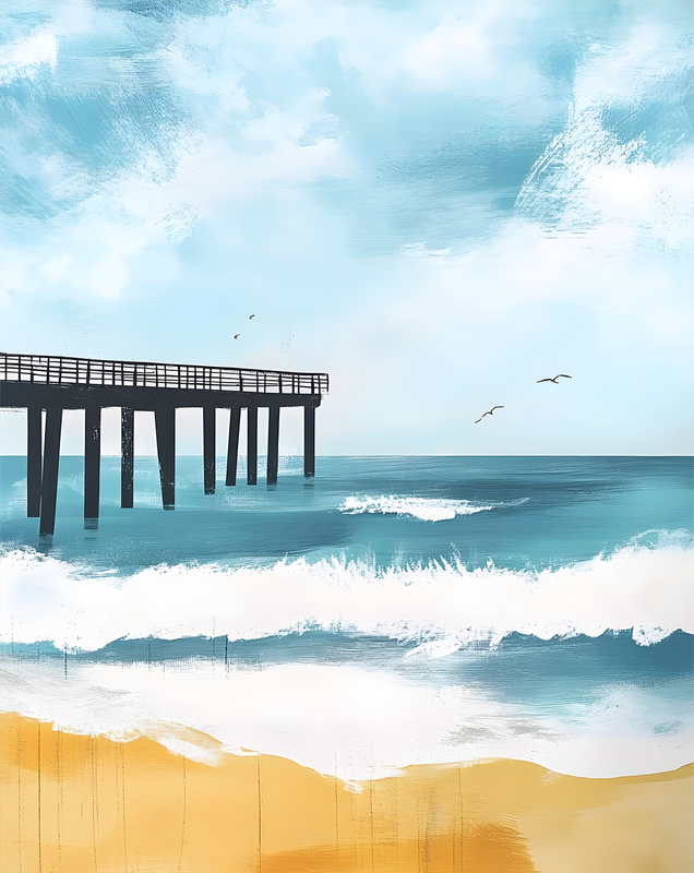 Inspired by Ocean Escapes – This artwork captures the essence of seaside relaxation and long beach strolls, perfect for those who dream of coastal getaways or are drawn to the tranquility of the sea. The silhouetted pier adds architectural interest and a sense of quiet perspective.