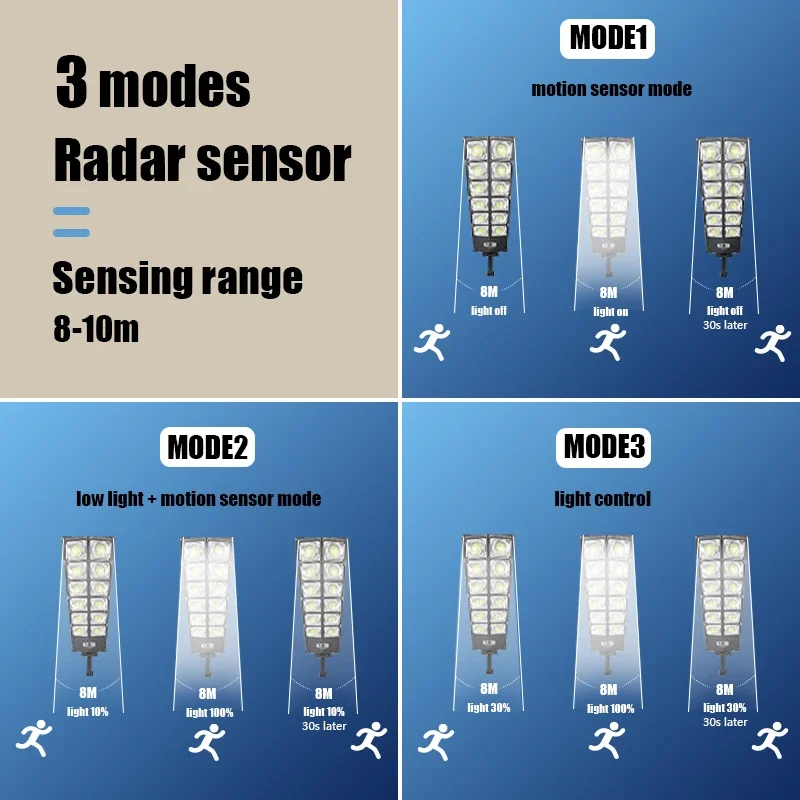 Mode 2: dim light + human induction + light control. It will auto turn on dim light at night, when people come close about 3-5m, it will turn on bright light for 20-25s, then auto turn dim light.