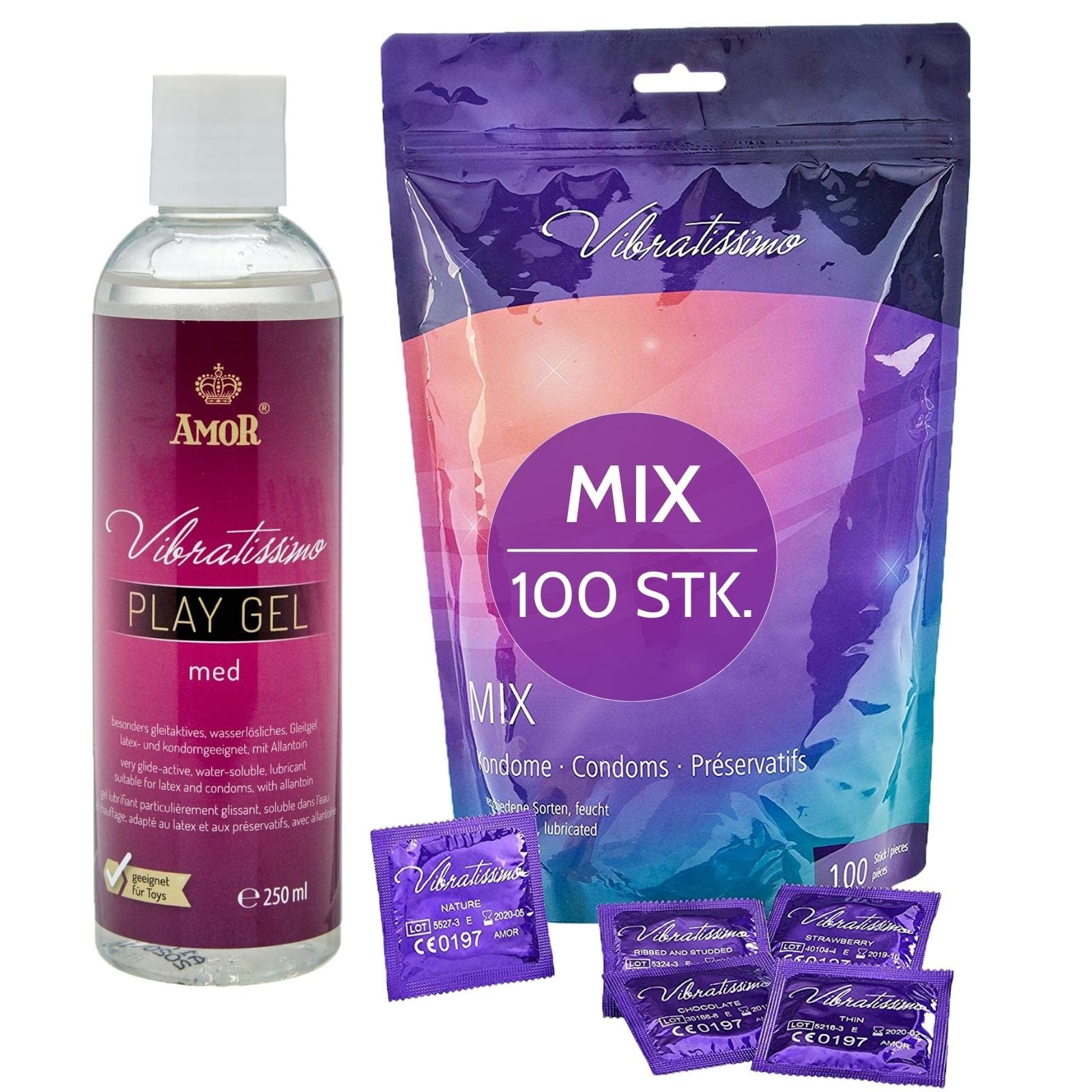 Kondome Mix 100er Pack gemischt & Gleitgel Set I gefühlsecht & extra feucht I Kondom-Beutel dünne Wandstärke & Aromatisiert I Kondome hauchzart genoppt & gerippt