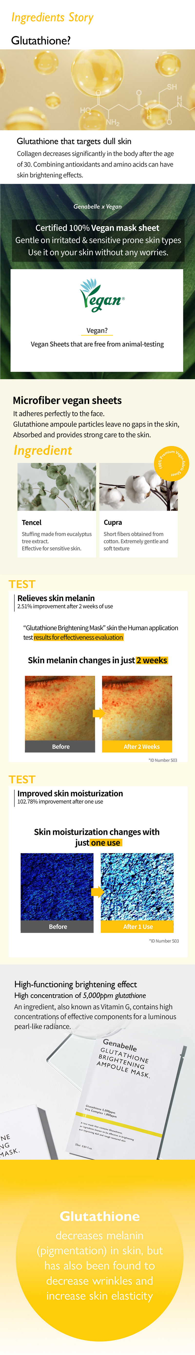 ONE WHOLE AMPOULE INCLUDED: Each sheet mask is drenched in one Glutathione Brightening Ampoule essence and can be applied on the rest of the neck and body for extra moisturization.