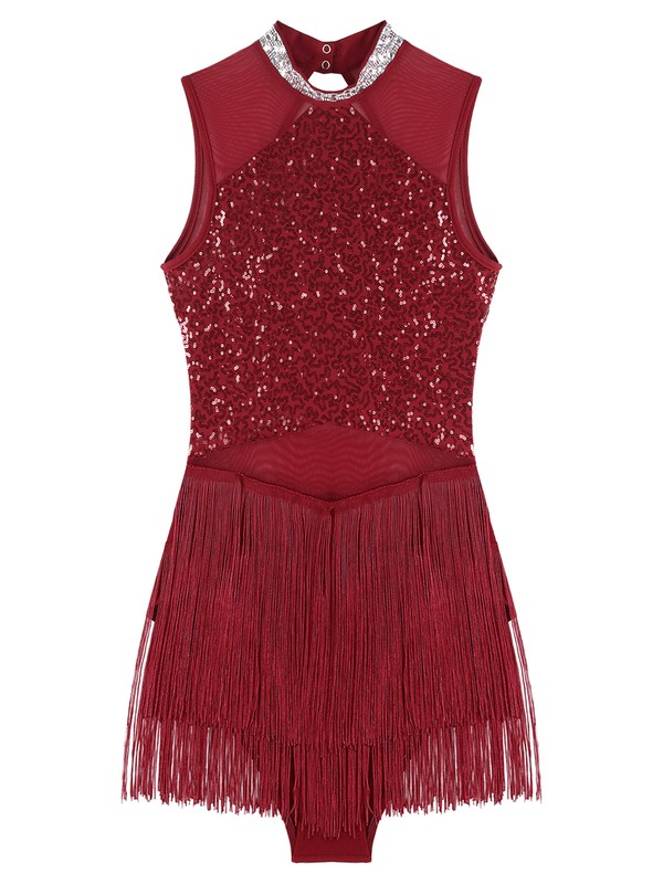 Sleeveless fringed leotard for women, mock neck with 2 press buttons for easy wearing, open back, shoulder and waist with sheer mesh detail.