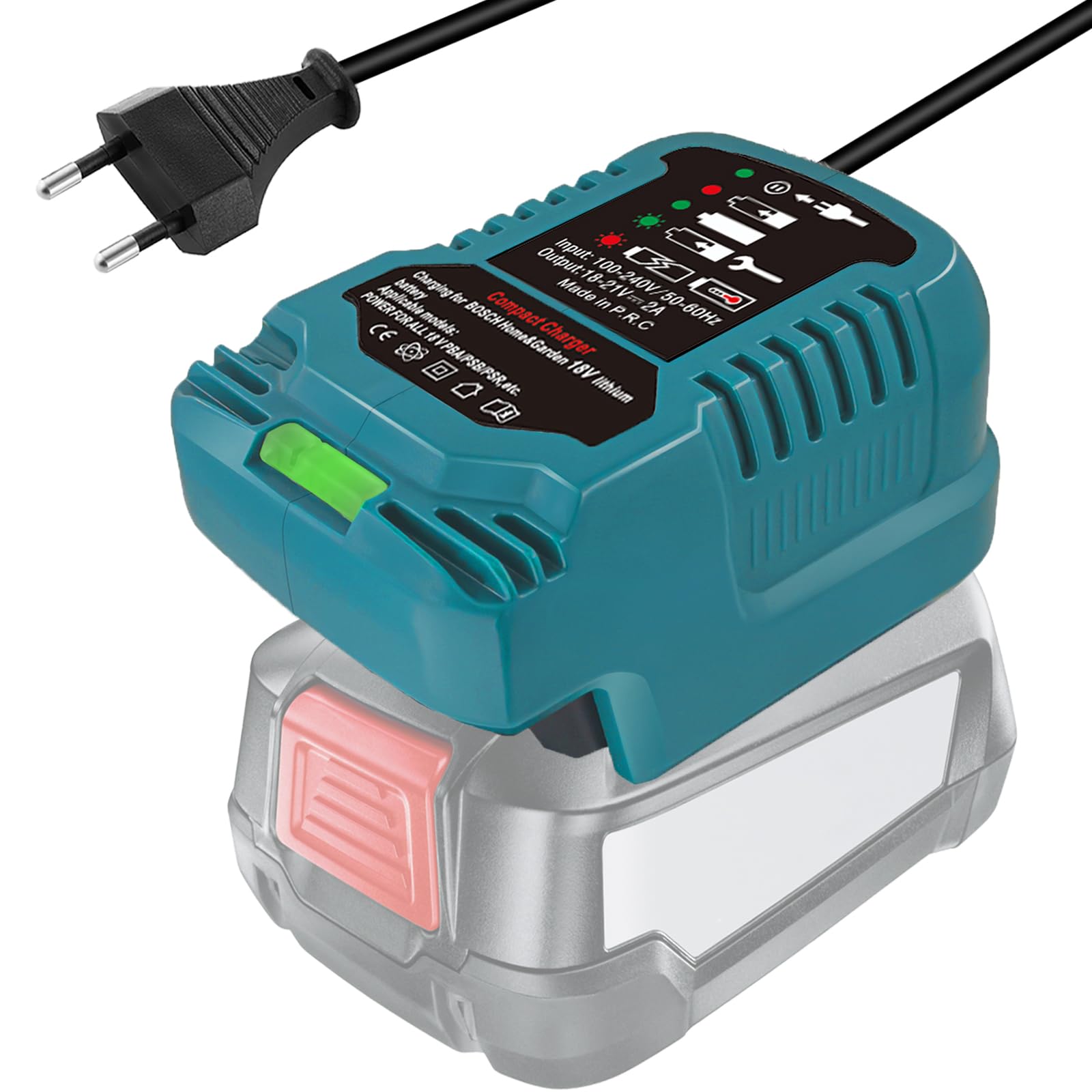 - Input and Output:——Das Batterieladegerät für Bosch Home & Garden System PBA Akku erfordert 220V 60hz Eingangsleistung und hat die Standard-2-poligen EU-Stecker. 18V 2 A DC-Ausgang.
