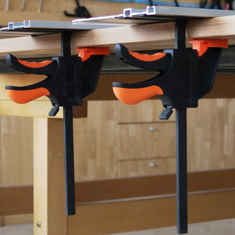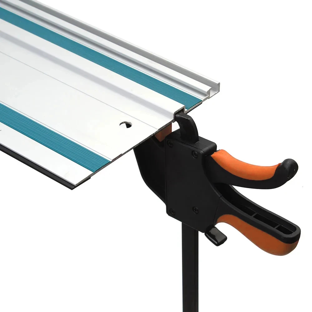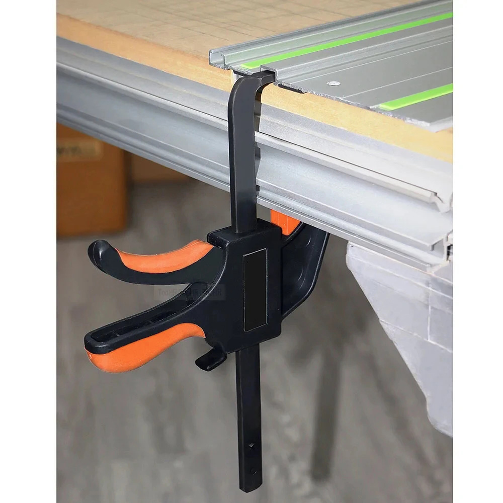 Description: PERFECT FIT: The 6-inch/160mm Universal Guide Rail Bar Clamps are designed to fit seamlessly into the recess of the guide rail, ensuring a secure and precise connection between the clamp and the rail. TRACKSAW COMPATIBILITY: These clamps are specifically created for use with the TrackSaw guide rail system, providing enhanced stability and accuracy during cutting tasks. This results in cleaner and more precise cuts, making them ideal for woodworking projects. EFFORTLESS SETUP: With their one-handed operation, these clamps offer a convenient and efficient setup process. You can easily position and secure the clamp with just one hand, saving you time and effort. UNOBTRUSIVE CLAMPING: The quick-release clamps are ingeniously designed to anchor in the slot under the rail, allowing for unobtrusive clamping onto the workpiece. This ensures that the clamps do not interfere with the cutting process, providing a clear and obstruction-free workspace. VERSATILE APPLICATION: These clamps offer more than just guide rail connection. They can also be utilized for clamping smaller bits of wood together, whether for adhesive purposes or for cutting with a different saw. This versatility expands their usefulness beyond guide rail tasks, making them ideal for DIY projects. RELIABLE STABILITY: The quick-release clamps securely anchor onto the rail, providing a stable and secure connection. This stability minimizes any potential movement or shifting of the workpiece during cutting, resulting in cleaner and more accurate cuts. DURABLE CONSTRUCTION: Crafted with high-quality materials, these clamps are built to withstand the demands of woodworking tasks. Their robust construction ensures longevity and reliable performance, making them a valuable addition to your toolkit. The 2 pack black color adds a sleek and professional look to your workshop. COMPATIBILITY Compatible: FESTOOL, Makita, DEWALT, metabo, RIDGID, einhell, Mafell, Milwaukee, RYOBI, BRAGE, EASEMAN, Scheppach, MATRIX, AEG, WEN Incompatible: Bosch Specification: Guide Rail Size: 11.3*5.6mm Material: Steel Overall length: 310mm Throat depth: 60mm Clamping range: 160mm Clamping force: 0-120KG Color: Black Style: Track Saw Clamps Quantity:2pcs Package included 2 x Track Saw Clamps