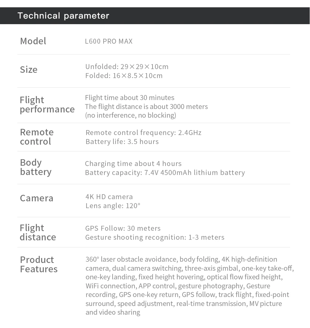 Drone Model: L600 PRO MAX (with or without obstacle avoidance device optional)