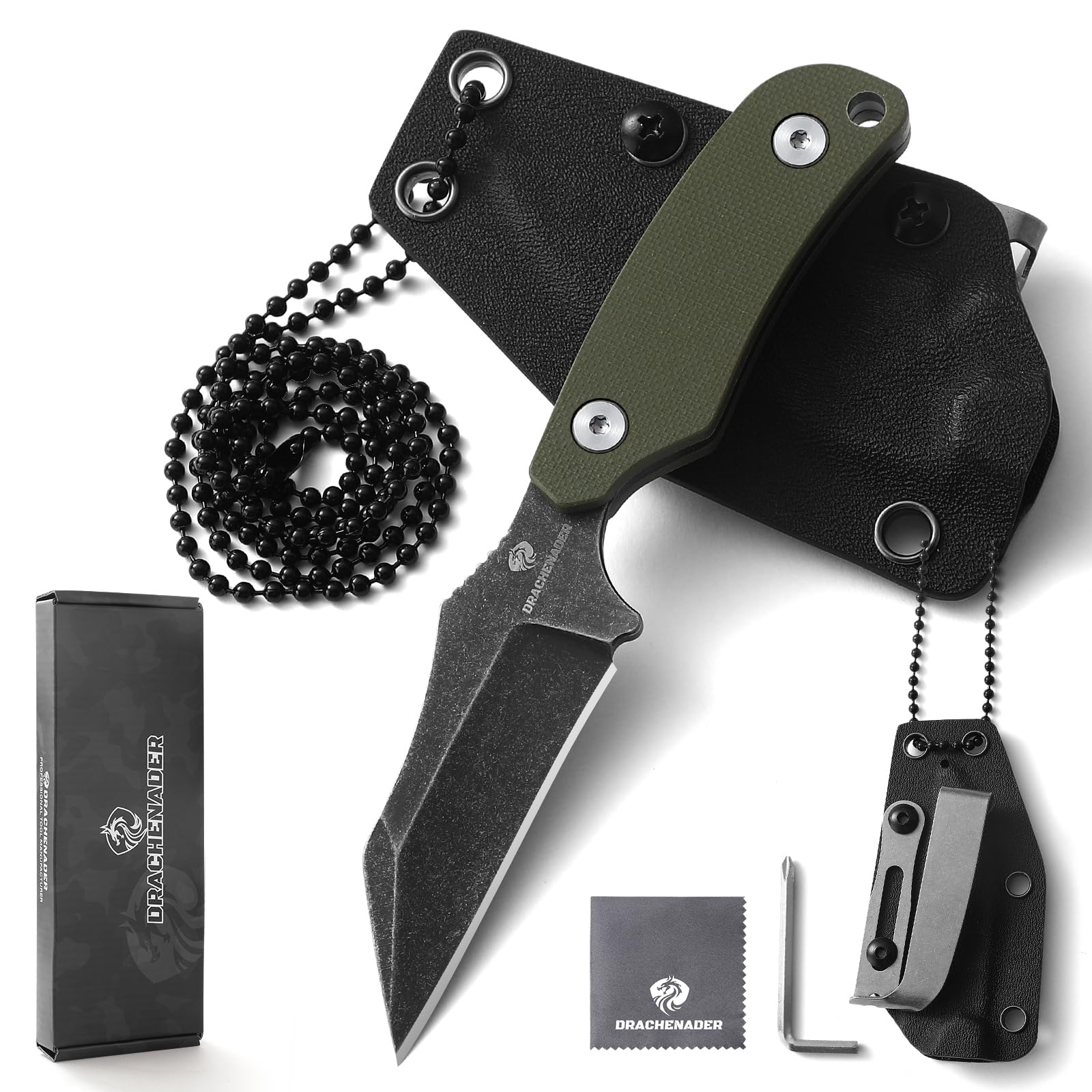 Neck Knife Klein X-WH, Wharncliffe D2 Stahl Feststehende 7, 6 cm Klinge, Full Tang mini Messer mit Kydex Scheide, Kugelkette, und Gürtel-Clip, Blackwash-Finish Klinge + G10 Griff Grün