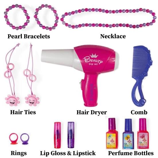 Fashion set includes: 2 pearl bracelets, 1 pearl necklace, earrings, 4 rings, 2 perfume containers, 1 lipstick, 1 lip gloss, 1 comb, 2 hair clips and working hair dryer Great for solo or group play, Requires a total of 7 AA batteries (3 for the Piano, 3 for the Mirror, 1 for the Hair Dryer), not included